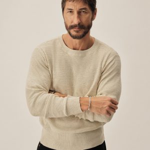 Classic fit short sleeve sweater tee with a straight hem. Yarn-dyed 16 gauge cotton jersey features light slub texture. Features double layer 1×1 ribbing at the collar and rib finishing at the cuffs and hem. Constructed with hand-linked seams for improved durability.