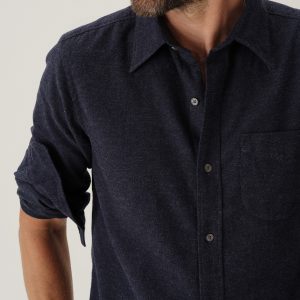 Classic fit button down collar shirt cut from a proprietary 3 oz blend of cotton and tencel. Details include mother of pearl buttons, a single scallop pocket, and a box pleat at the back. Constructed with clean finished seams. Garment washed for a lived-in look and feel.