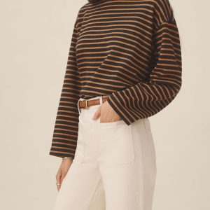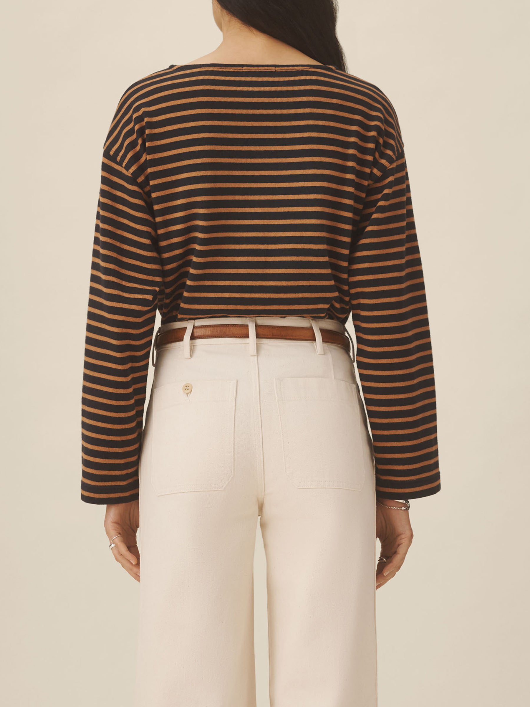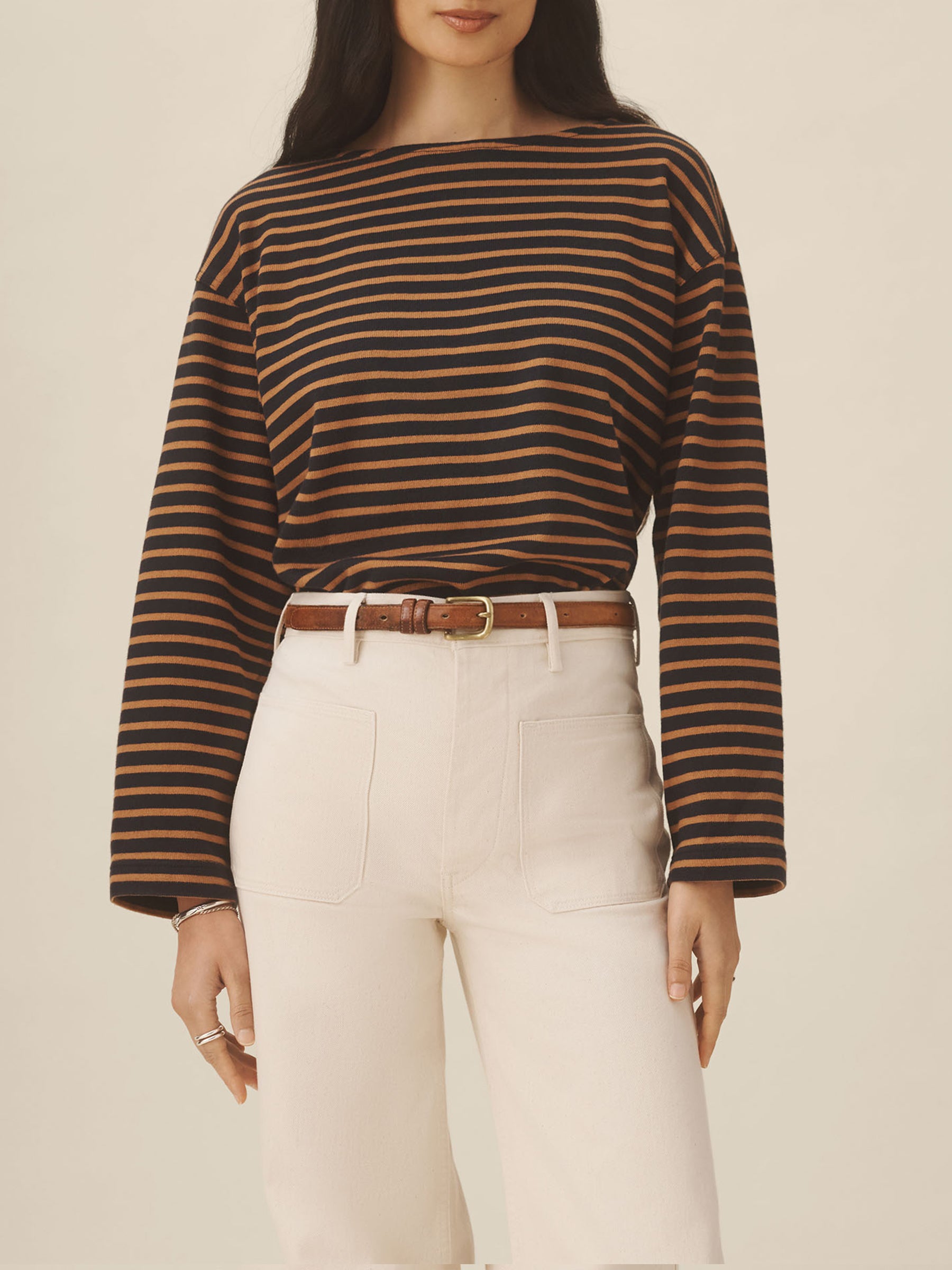 Relaxed long sleeve boatneck tee inspired by the classic French breton shirts. Cut from sturdy, compact 350 GSM cotton. Details include a taped boatneck neckline and side slits at the hem. Constructed with flatlock stitching throughout and double needle coverstitching at the hem. Garment washed for a lived-in feel.