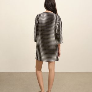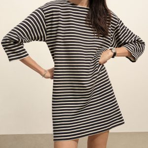 Inspired by classic French Breton stripe shirts, a relaxed boatneck shift dress with long sleeves, made from heavy cotton jersey. Detailed with herringbone tape along the side slits and neckline and finished with a garment wash for a soft, broken-in feel.
