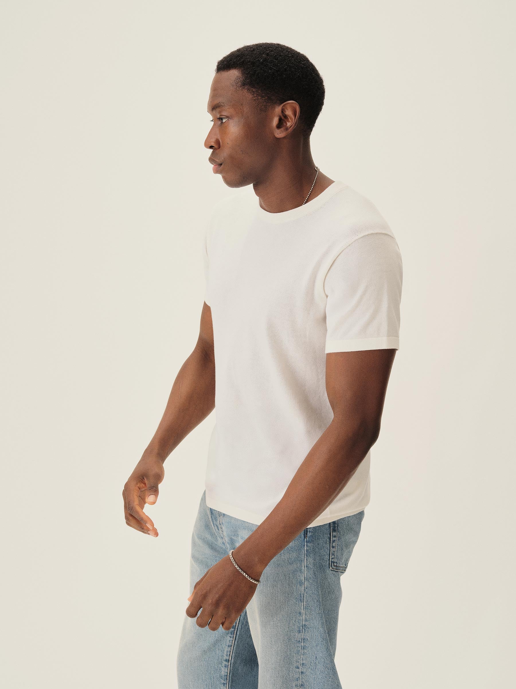 A fully fashioned tee that draws inspiration from the lifestyle surrounding Lake Como in the 1960s. Knit from an ultrafine blend of yarn-dyed organic Egyptian cotton and cashmere, spun in Italy. Featuring tubular finishes at the cuffs and bottom hem, and a shallow sleeve cap.
