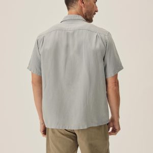Classic fit short sleeve camp shirt cut from a 5.25 oz. yarn-dyed linen blend with a subtle luster and relaxed drape. Features a six-button placket with mother of pearl buttons, twin patch-and-flap chest pockets, straight hem, and a loop and button closure at the neck. Constructed with clean finished seams. Garment washed with enzymes for a lived-in feel.