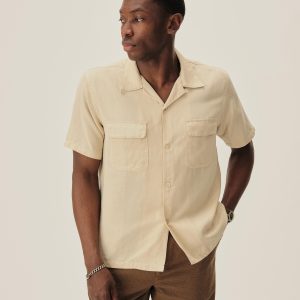 Classic fit short sleeve camp shirt cut from a 5.25 oz. yarn-dyed linen blend with a subtle luster and relaxed drape. Features a six-button placket with mother of pearl buttons, twin patch-and-flap chest pockets, straight hem, and a loop and button closure at the neck. Constructed with clean finished seams. Garment washed with enzymes for a lived-in feel.