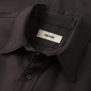 Slim fit long sleeve button up shirt in 5.25 oz. cotton/rayon twill with a subtle luster and an easy drape. Details include mother of pearl buttons, a single spade pocket at the chest, and a box pleat at the back yoke. Constructed with single needle topstitch detailing with double needle stitching at the collar and cuffs. Garment washed with softener for a lived-in feel.