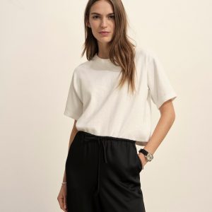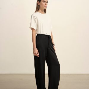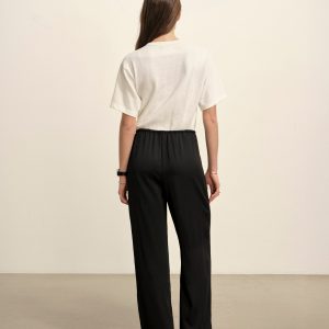 A silky, smooth rayon pull-on pant with a high-rise, straight leg, and an elastic drawcord waistband. Featuring hidden on-seam pockets, French seams, and garment washed for softness.