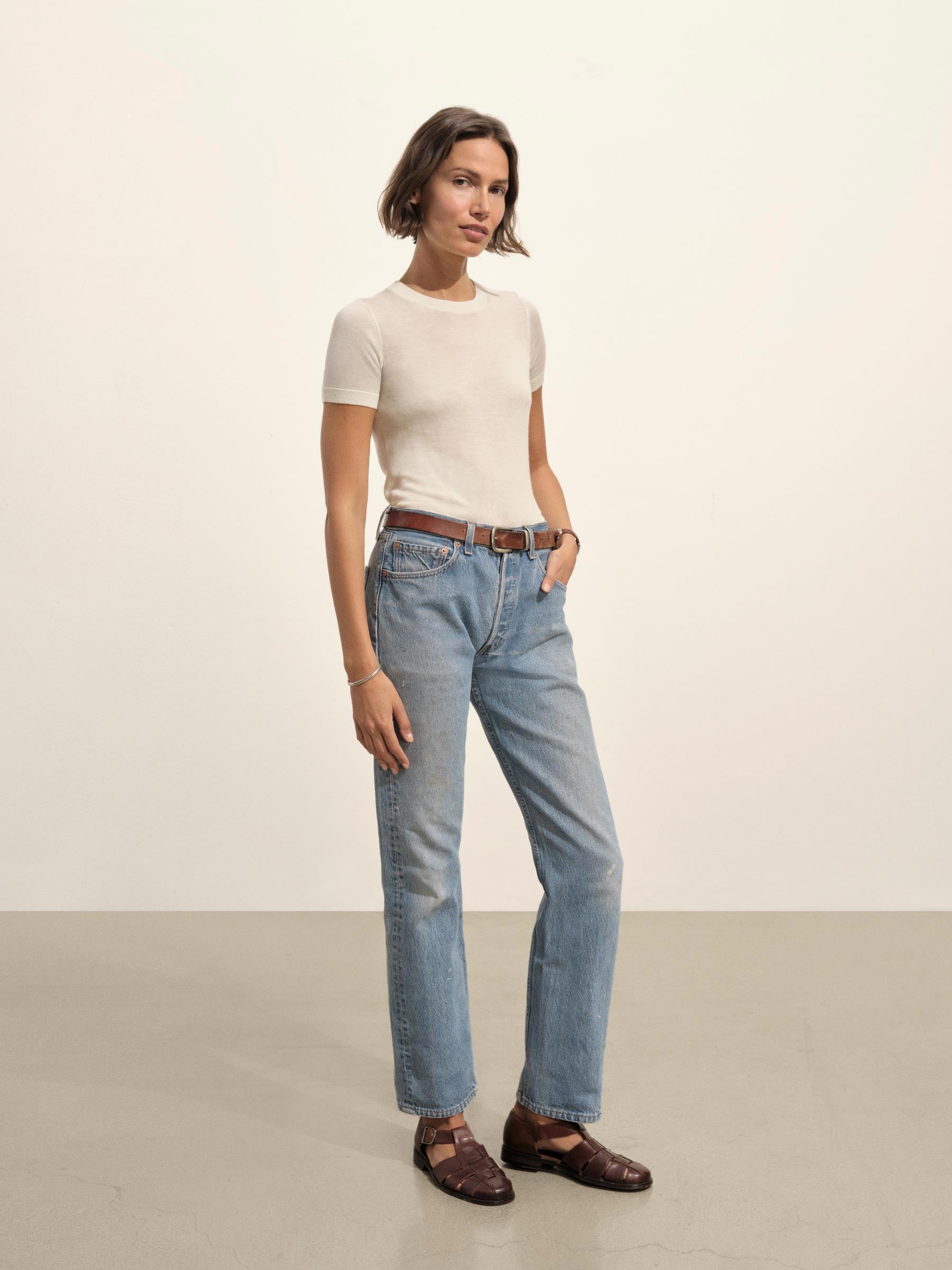 Crewneck sweater knit tee with a relaxed, slim fit. Spun from a yarn-dyed blend of merino wool, silk, and cashmere. Garment washed for added softness.