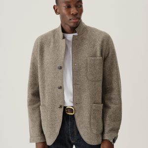 Classic fit chore coat with a slimmer cut through the arms and room in the torso for layering. This 340 GSM felted merino wool has been twice boiled for improved insulation and durability. Details include three patch pockets, real horn buttons, and a notch collar. Constructed with hand-sewn facings and cover-stitching throughout.