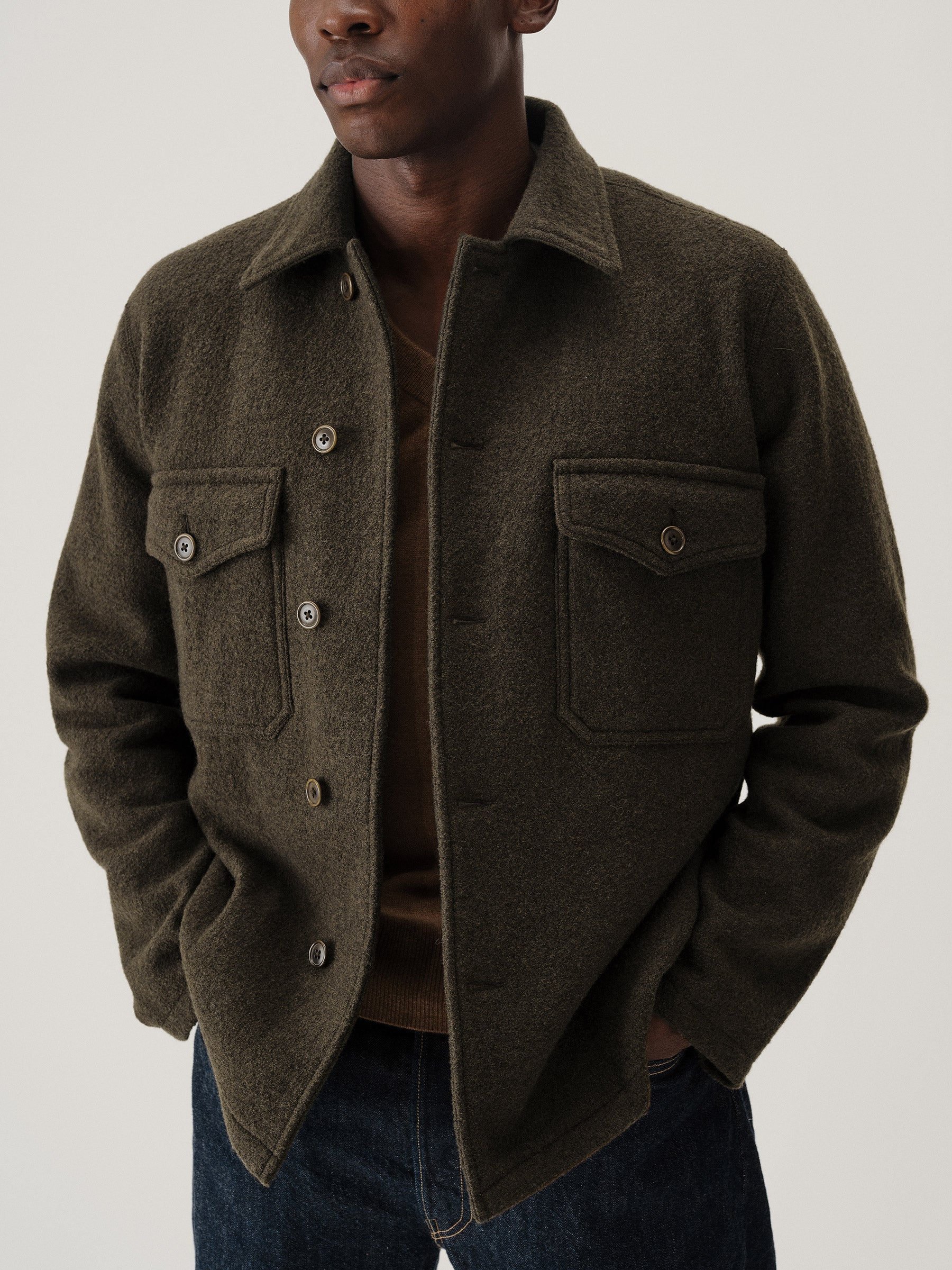 Classic fit field shirt in 340 GSM felted merino wool, twice boiled for improved insulation and durability. Details include patch-and-flap chest pockets and a button front closure. Constructed with hand-sewn facings and cover-stitching with flat seams for comfort.