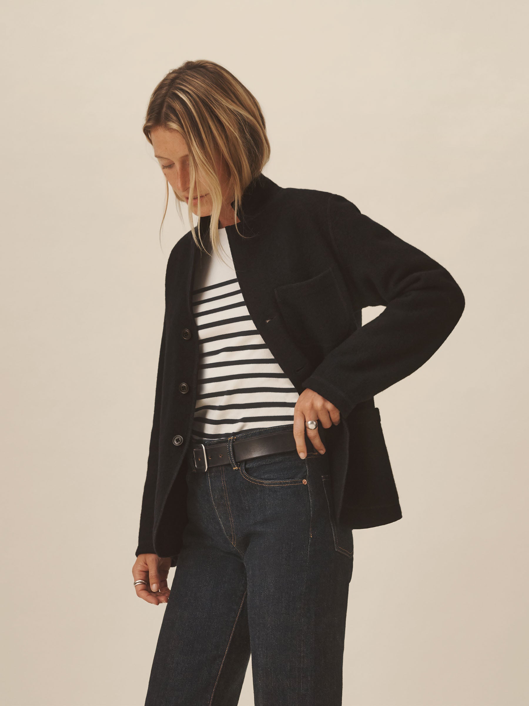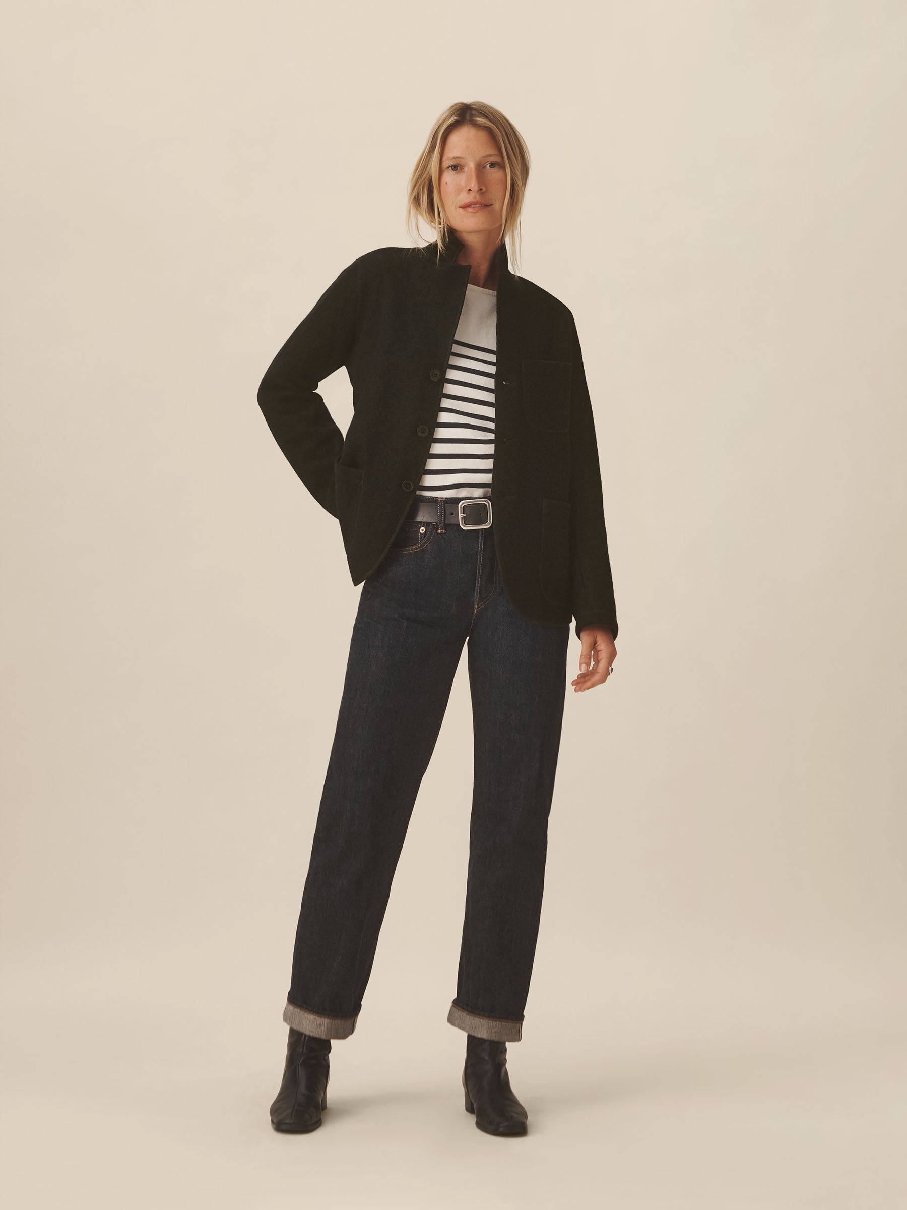 Classic fit chore coat with a slimmer cut through the arms and room in the torso for layering. This 340 GSM felted merino wool has been twice boiled for improved insulation and durability. Details include three patch pockets, horn buttons, and a notch collar. Constructed with hand-sewn facings and coverstitching throughout.
