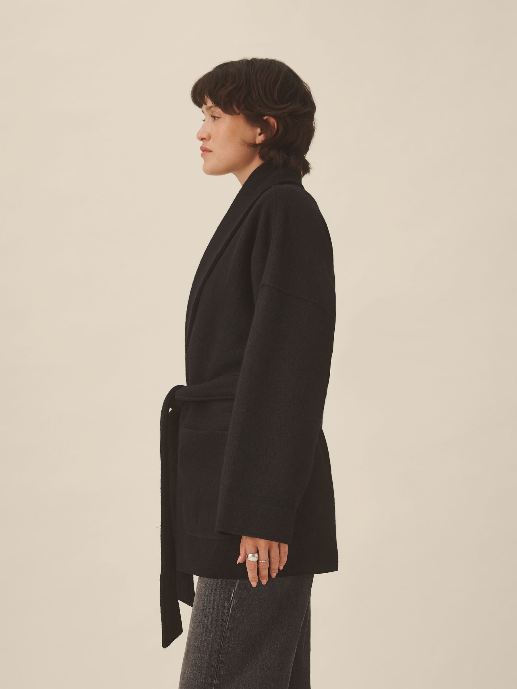 An easy layering piece that combines the warmth of a sweater with the function of a coat. Knit from merino wool yarns that are twice‑boiled into felt, it delivers insulation, breathability, and a naturally draped finish. Cut in a relaxed, throw‑on silhouette.