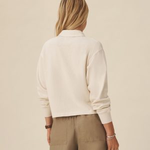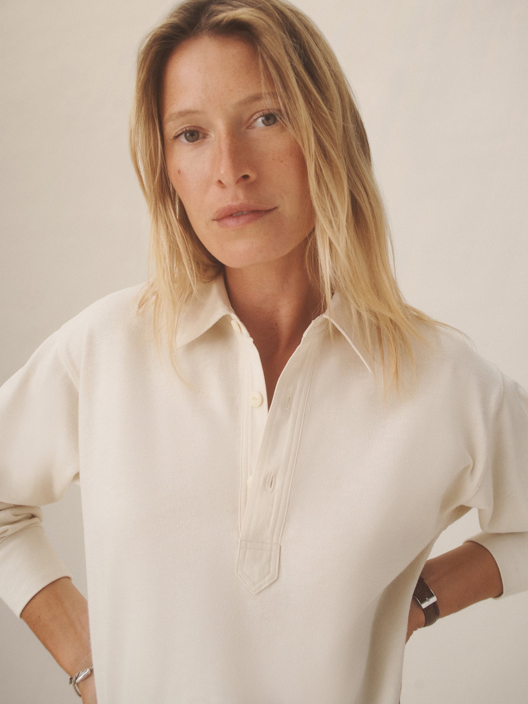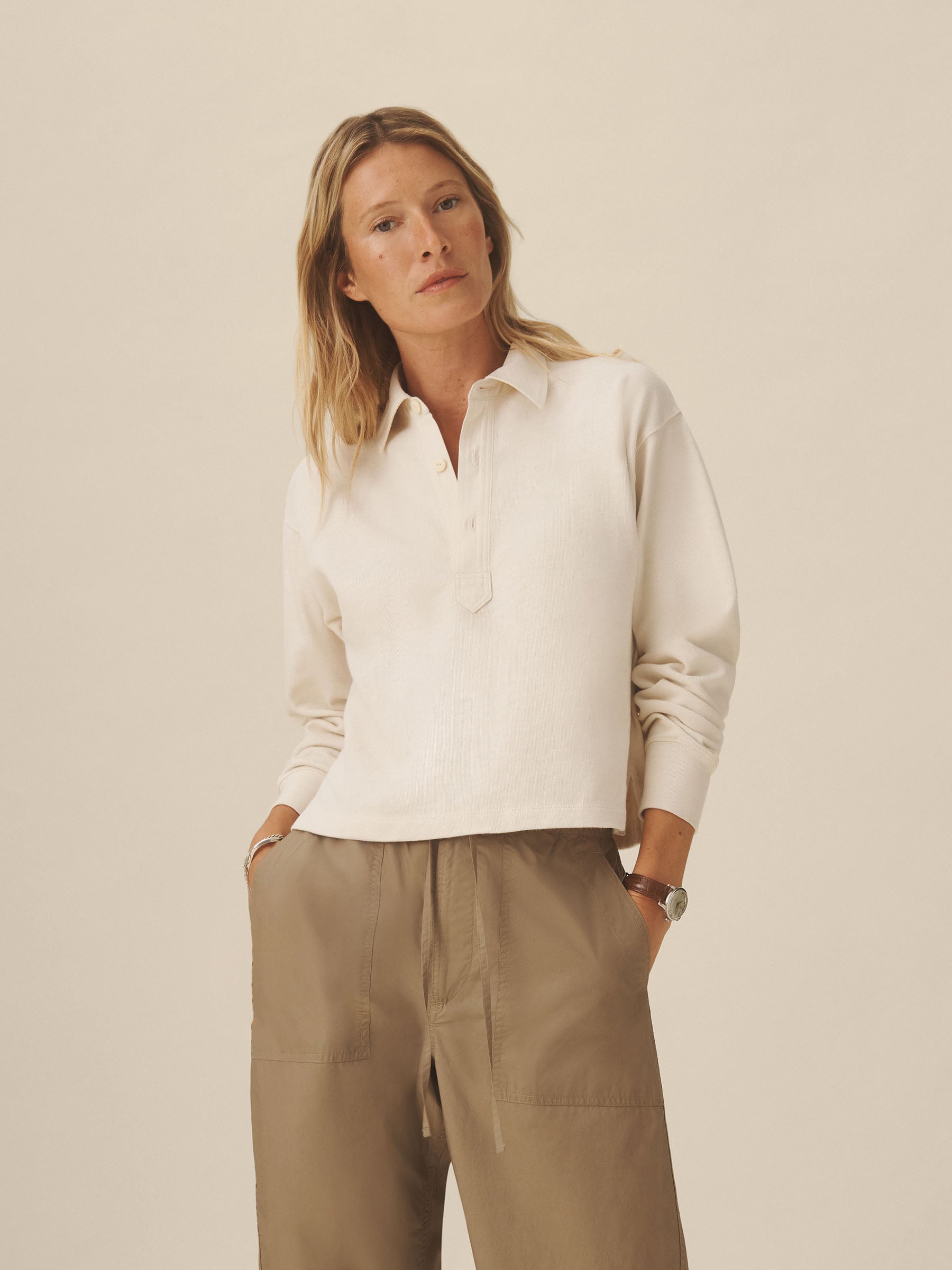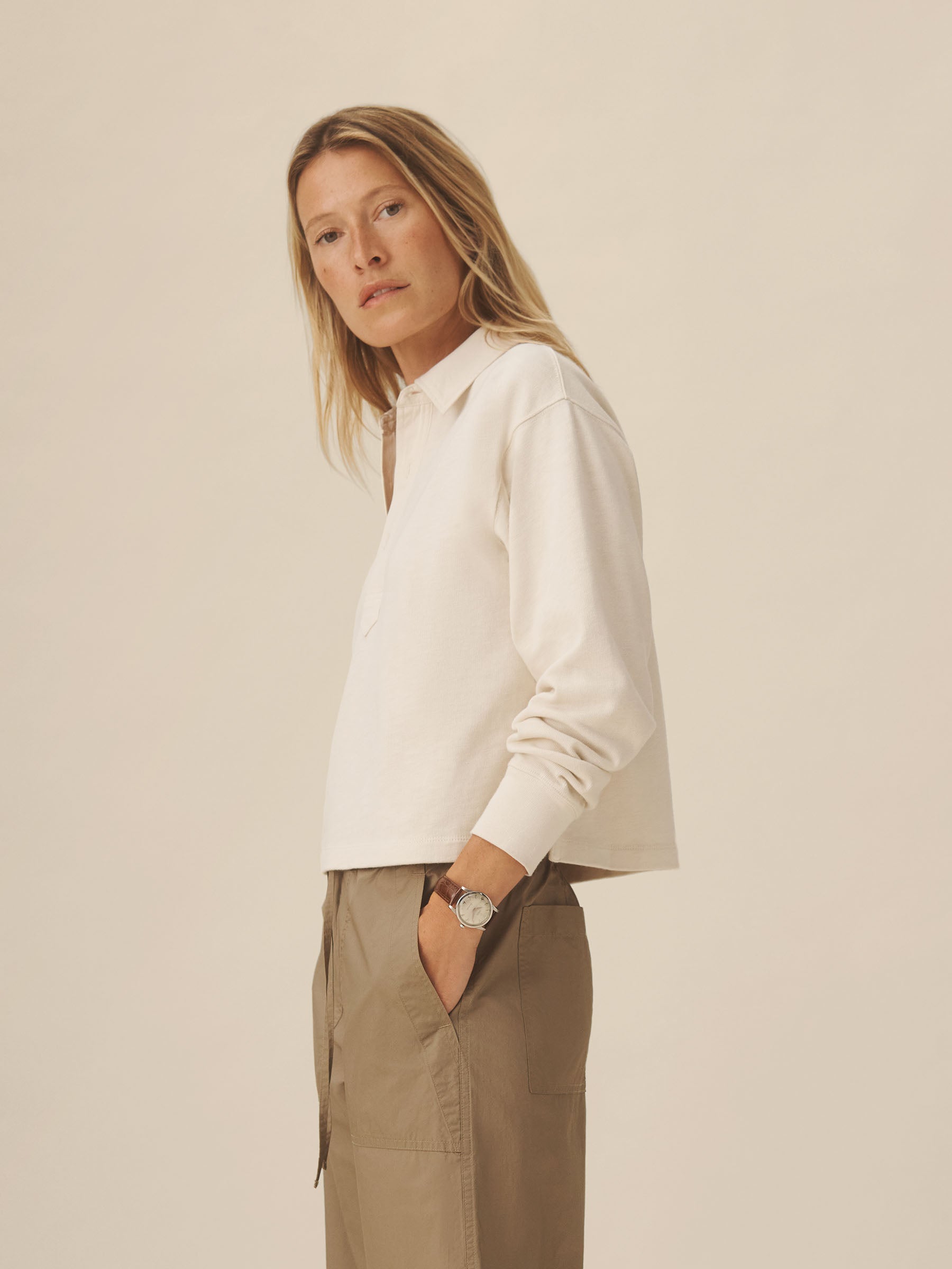 Inspired by the men’s Field-Spec Rugby, the women’s version is cut from 100% cotton in a dense slub jersey with a structured hand. Cut with a cropped, boxy fit and long sleeves, it’s designed with a woven twill collar and placket, tonal poly buttons at the center front, and herringbone-trimmed side slits.