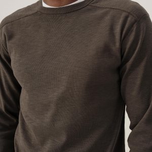 Nautical-inspired boxy fit short sleeve wide neck tee with a straight hem, longer sleeve length, drop shoulder, high neck, and wide ribbed collar. The soft cotton jersey, yarn-dyed in indigo and black sulfur stripe pattern, is about twice as heavy as our Pima tees, with tiny vertical ribs that gently glide across the skin. This is a solid, substantial stand-alone tee for cold weather that will pick up a ton of character over time.