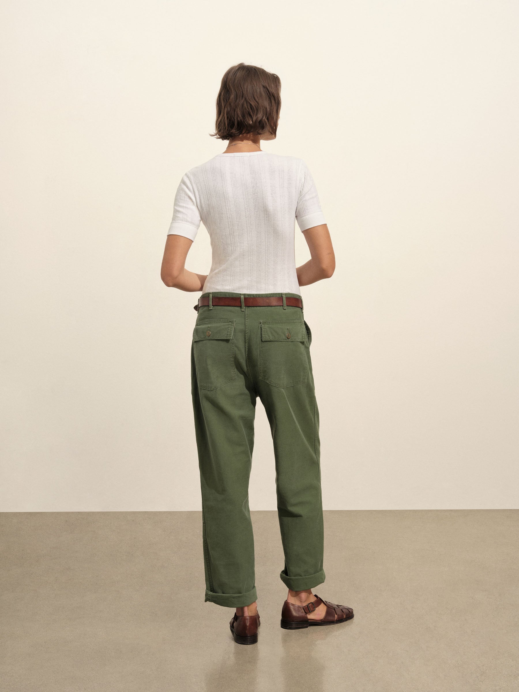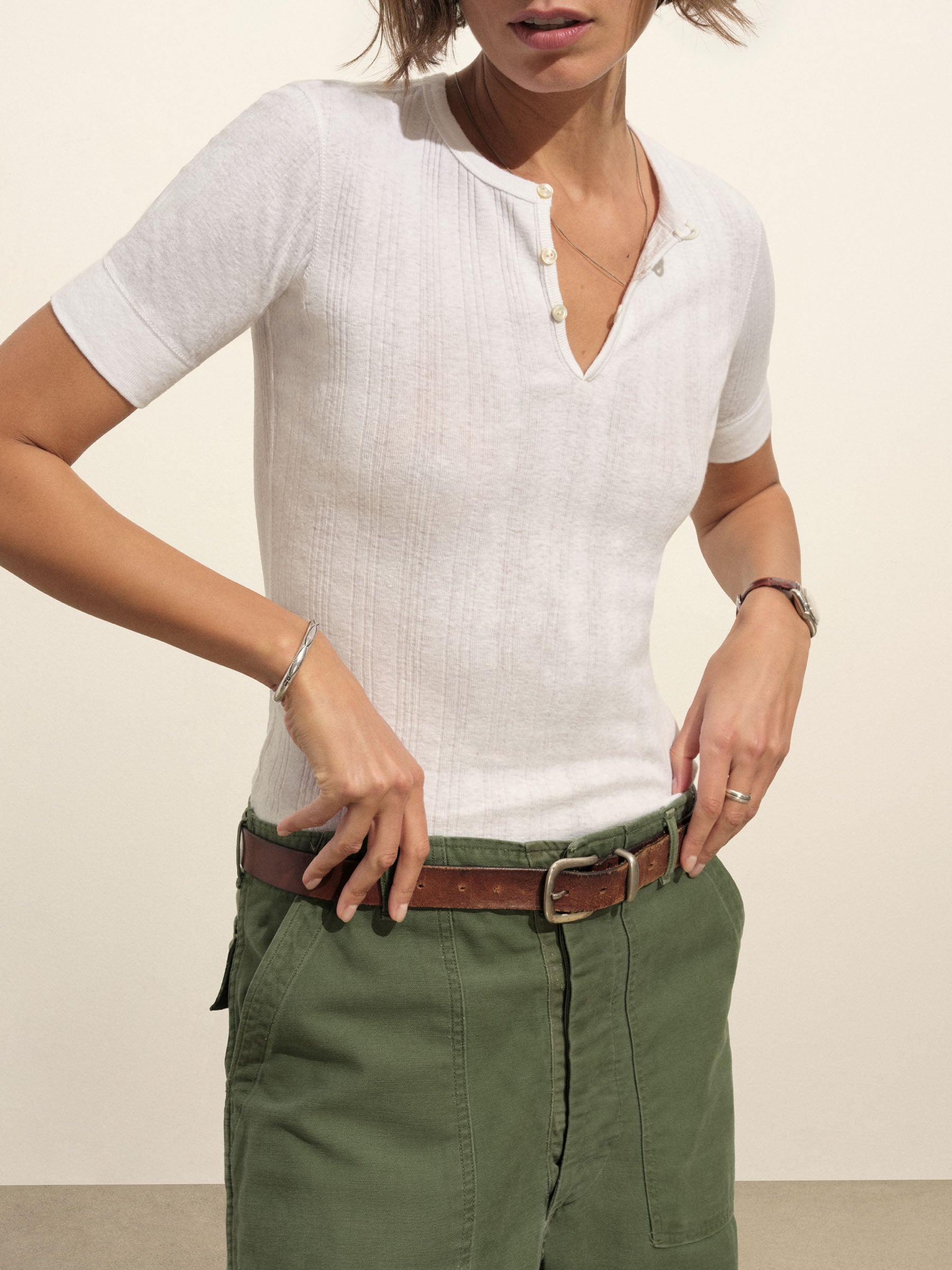 Military-inspired short sleeve henley, crafted from a superfine blend of new and recycled cotton with a subtle, textured rib. Featuring a three-button loop placket and sleeve cuffs. Finished with mother of pearl buttons and garment washed for a lived-in feel.