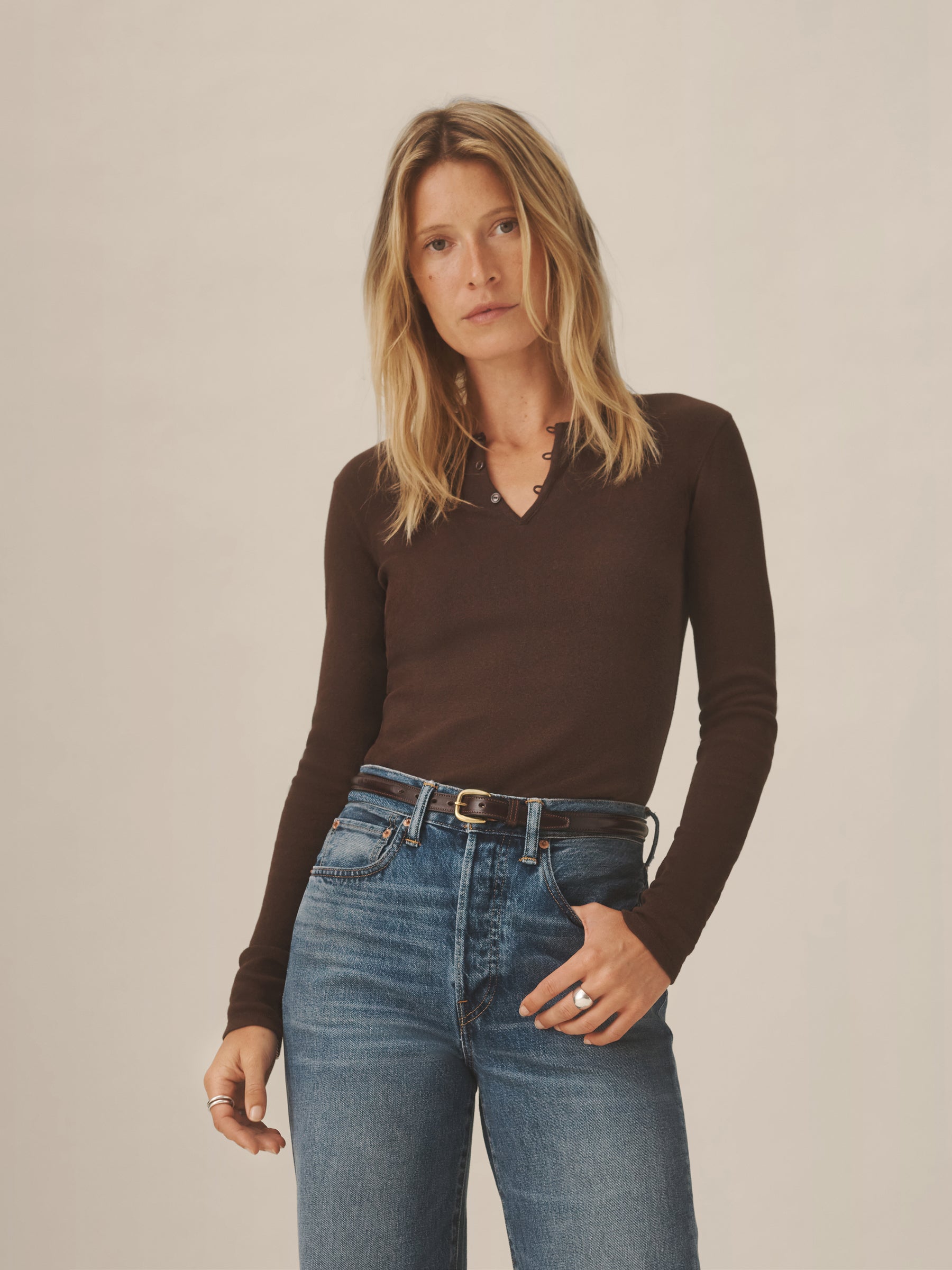 “Slim fit long sleeve henley cut from extra fine 170 GSM cotton with recycled content that holds its shape. Details include a a three-button loop placket with corozo fish eye buttons, and straight, clean finished hem and cuffs. Garment washed for a lived-in feel.