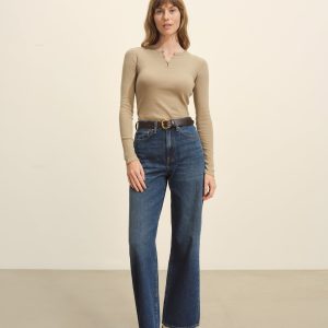 “Slim fit long sleeve henley cut from extra fine 170 GSM cotton with recycled content that holds its shape. Details include a a three-button loop placket with corozo fish eye buttons, and straight, clean finished hem and cuffs. Garment washed for a lived-in feel.