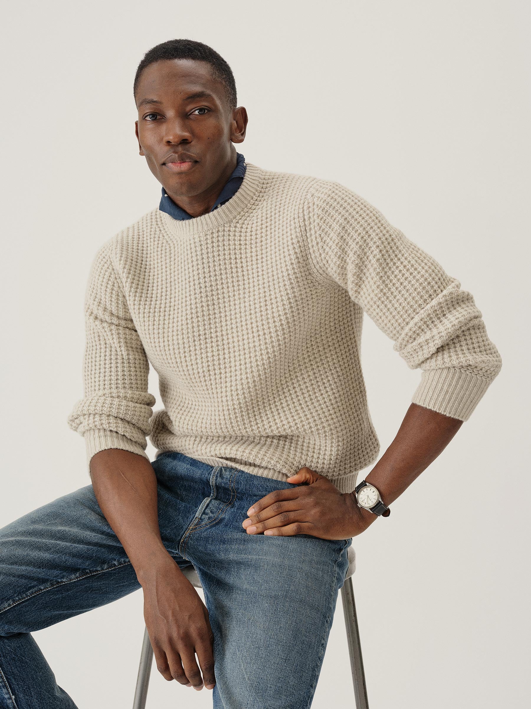 Classic crewneck waffle-knit from 5 gauge wool: a chunky, substantial yarn that’s soft to the touch. 95% Merino wool for warmth and durability, rounded out with 5% cashmere for added smoothness. The result: all the warmth, zero itch. Saddle shoulder for a comfortable fit with rib fashioning on the collar, cuffs, and hems.