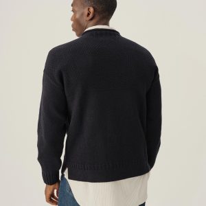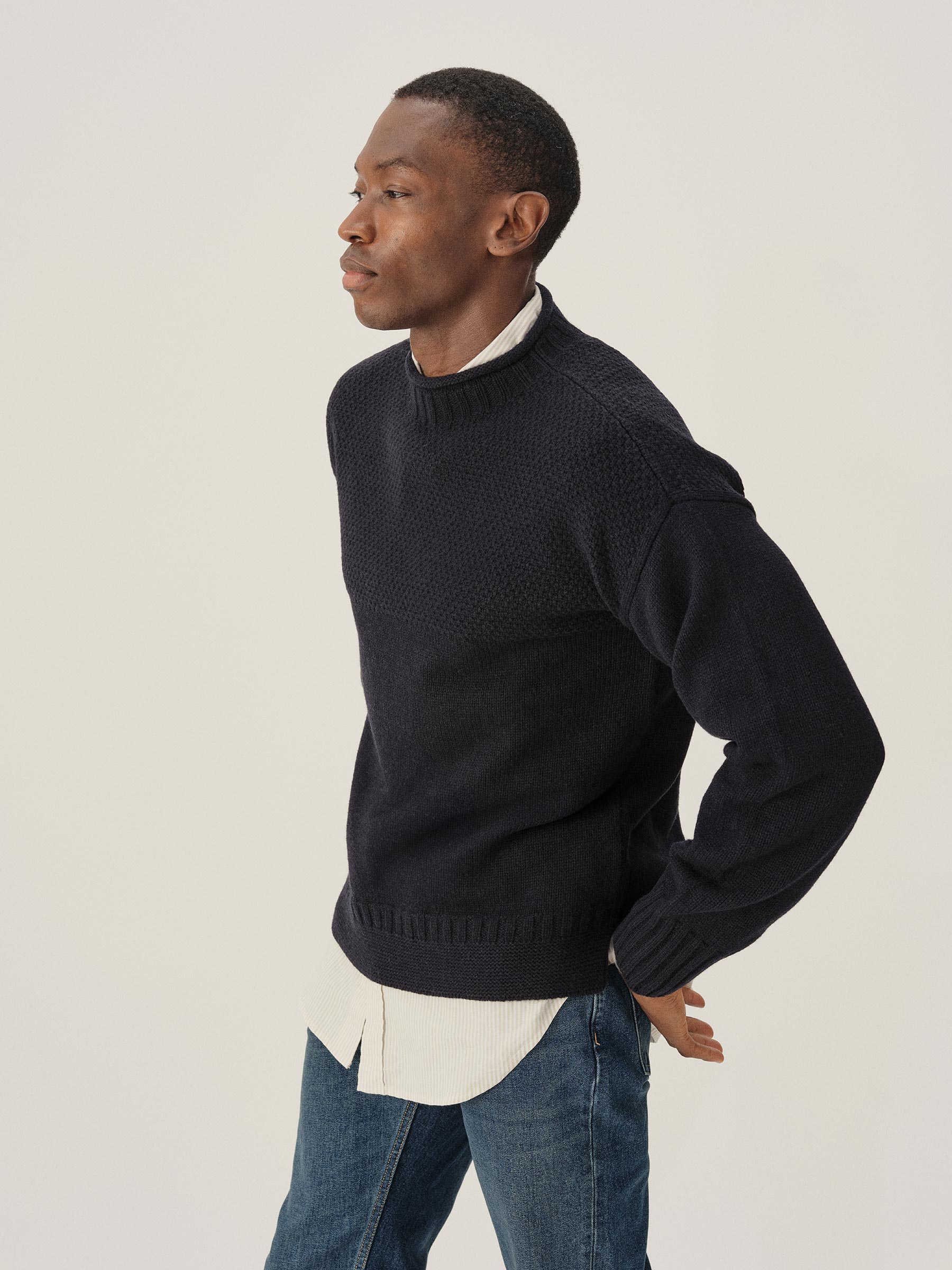 A nod to traditional fishman styles and workwear knits from the 1600s, our Guernsey Rollneck features a relaxed, slightly cropped fit in a comfortable 100% merino wool. Moss stitch upper body with rib finishes at cuffs and collar. Jersey roll at collar top edge with a garter stitch hem.