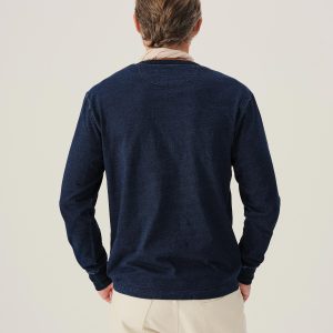 Classic fit long-sleeve henley, constructed with a durable, wrinkle-resistant three-button self-placket. Cut from a cotton hemp blend; each yarn is dipped in an indigo dye bath before knitting. Garment washed for a softer, lived-in feel.