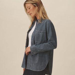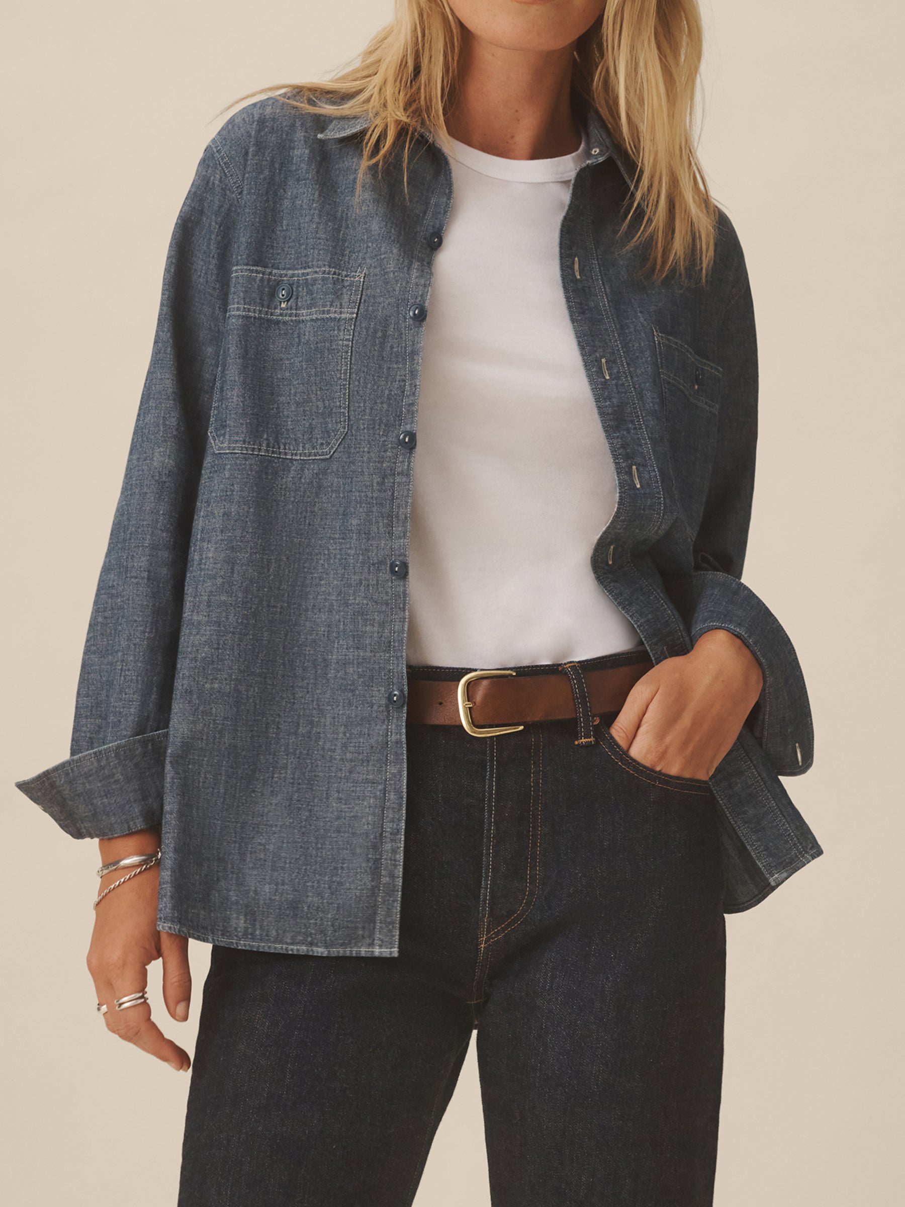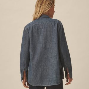 A work shirt cut from lightweight, yarn-dyed Japanese chambray. Modeled after 1950s workwear styles, it’s constructed with twin button-through chest pockets, durable felled seams, tonal 2-hole poly workwear buttons, and run-off stitching at the side gussets. Reinforced with discreet bartacks throughout.