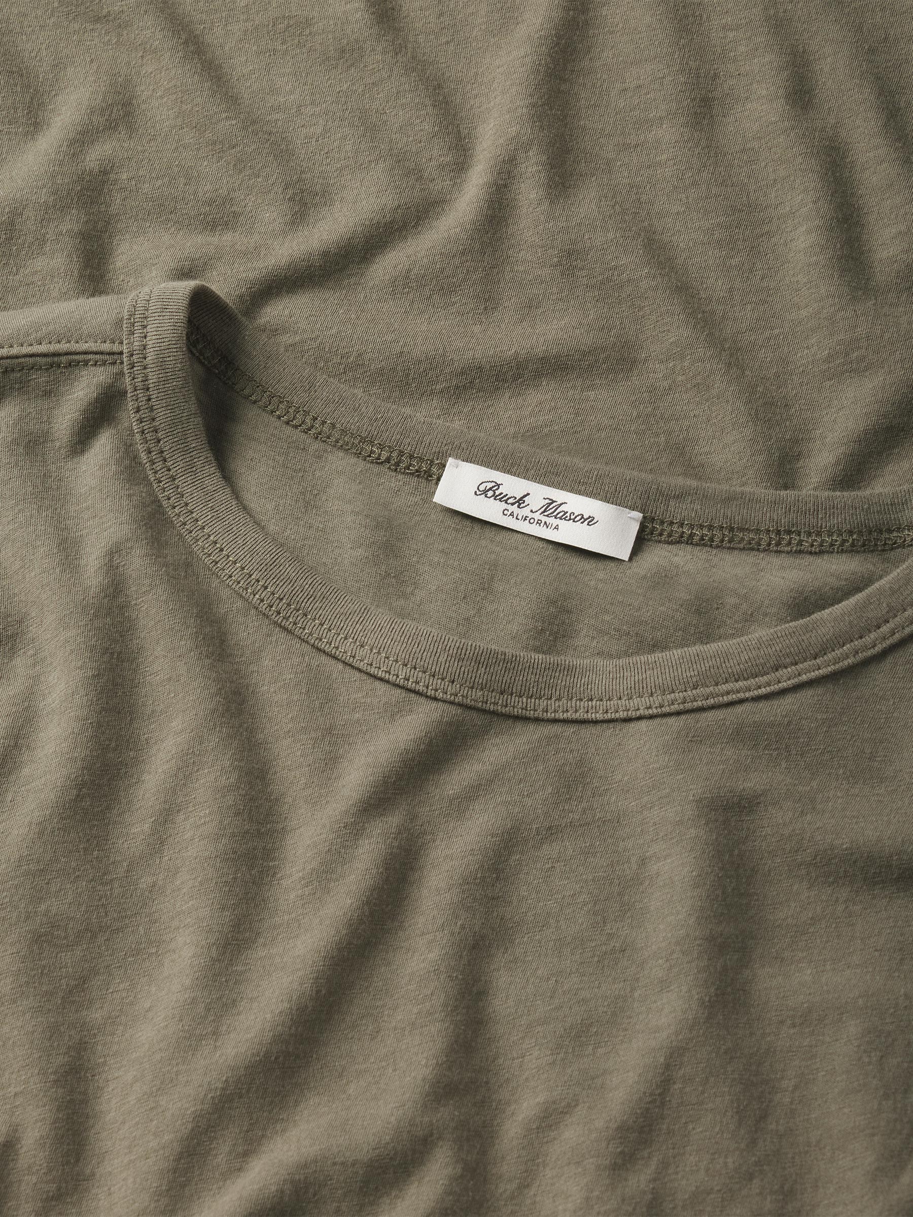 Crafted from a custom-spun, super fine 56 singles blended cotton-linen yarn, spun and knit exclusively in Japan. This fabric is designed to combine the smoothness of a premium yarn with the subtle texture of something more rugged. The result is a tee that’s smooth, cool, and light as air with a subtle silky hand feel. Finished with a rib-bound crewneck, blind hems at the sleeves and bottom, and overlocked seams.