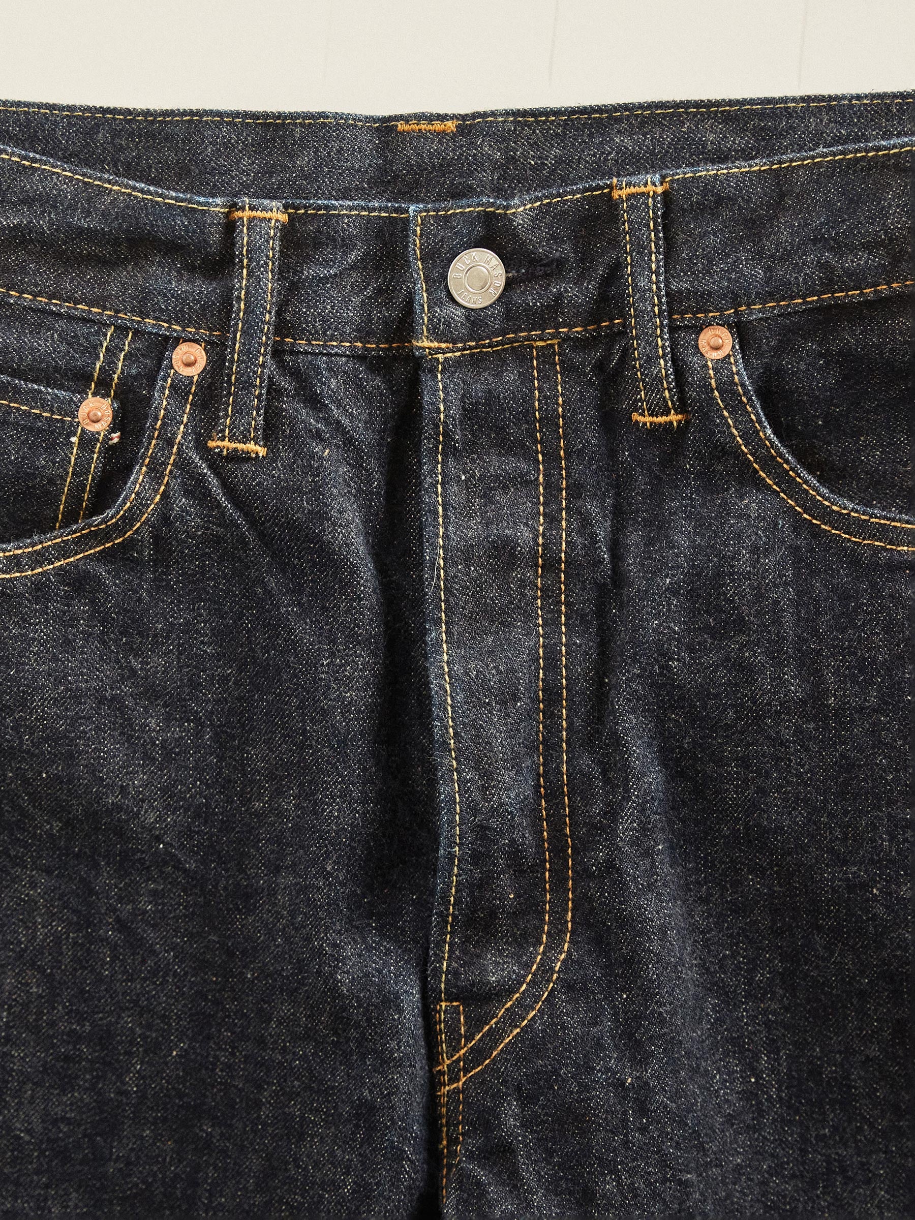 A classic 5-pocket jean in our Cowboy fit: Slightly higher rise with a tailored fit through the thigh and leg. Inspired by blue jeans from the 1940s through the 1960s, this shuttle loomed 14 oz. selvedge denim is unsanforized, and has an organic texture that develops more character with every wear. Garment rinsed for a lived-in feel. Details include copper rivets and a metal tack button fly.