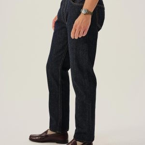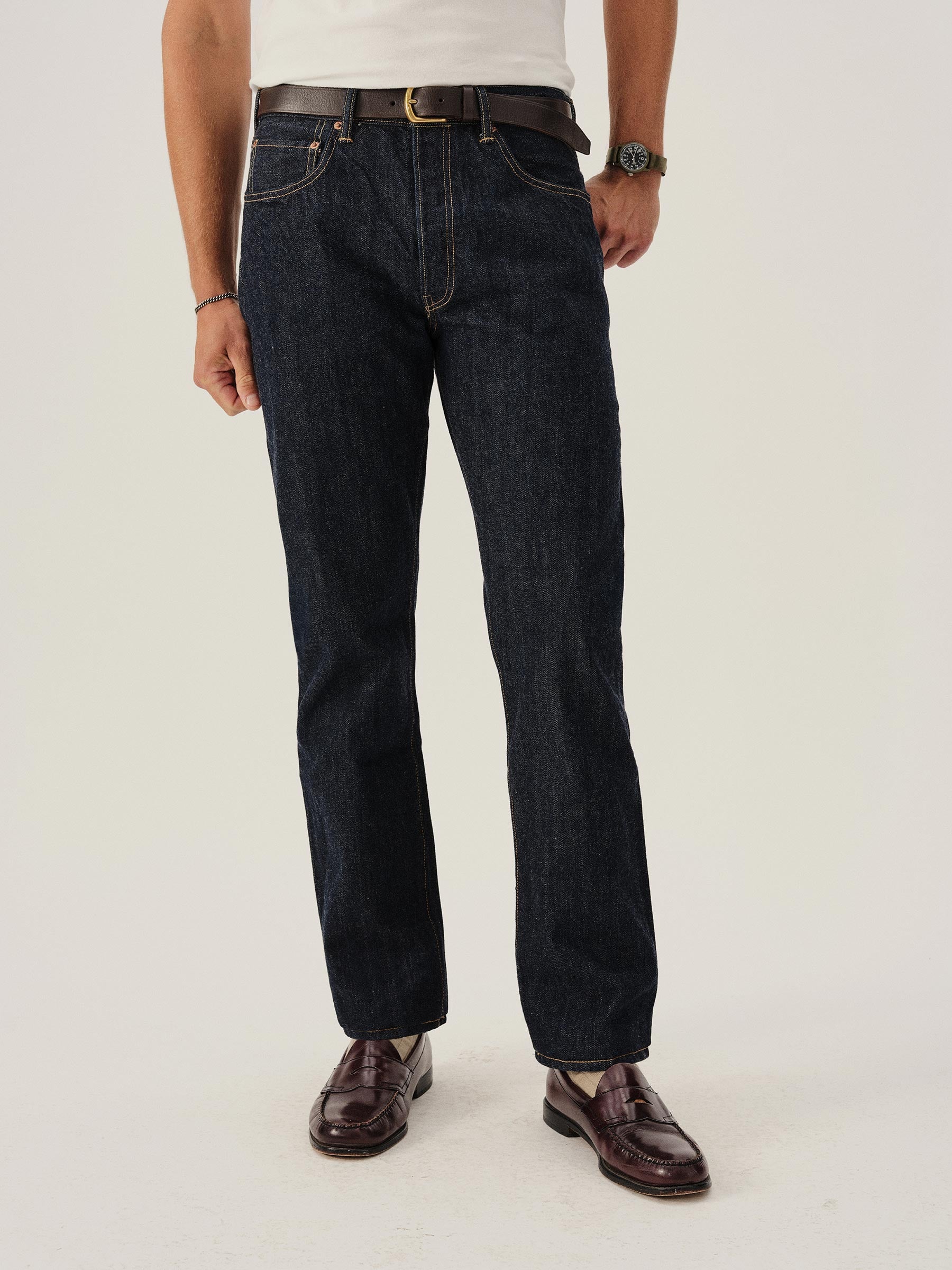 A classic 5-pocket jean in our Ford Standard fit: mid-rise, straight through the thigh with a taper below the knee. Inspired by blue jeans from the 1940s through the 1960s, this shuttle loomed 14 oz. selvedge denim is unsanforized, and has an organic texture that develops more character with every wear. Garment rinsed for a lived-in feel. Details include copper rivets and a metal tack button fly.