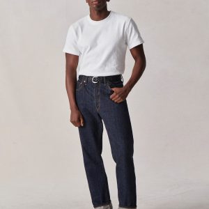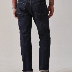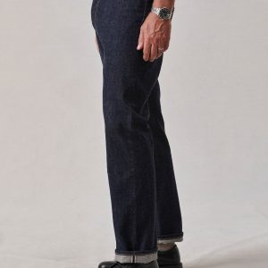 A classic 5-pocket jean in our Full Saddle fit: high-rise, straight through the thigh and leg. Inspired by blue jeans from the 1940s through the 1960s, this shuttle loomed 14 oz. selvedge denim is unsanforized, and has an organic texture that develops more character with every wear. Garment rinsed for a lived-in feel. Details include copper rivets and a metal tack button fly.