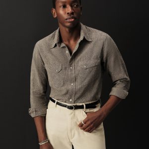 In the style of the 1940s, a classic fit western with no front yokes that lends itself to a more tailored style of dress, cut from a yarn-dyed blend of breezy linen and cotton. Featuring slanted pocket flaps, a pointed back yoke, and snap button fasteners.