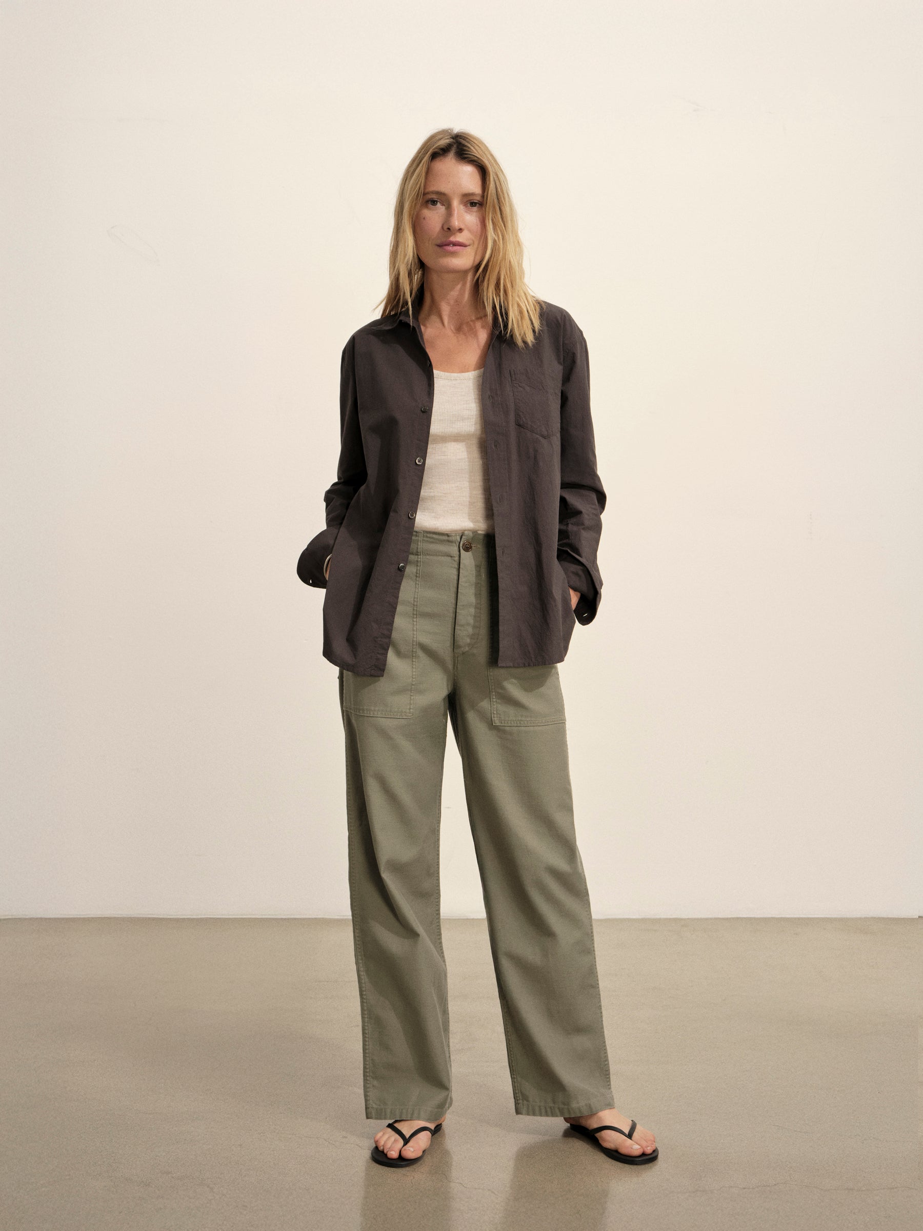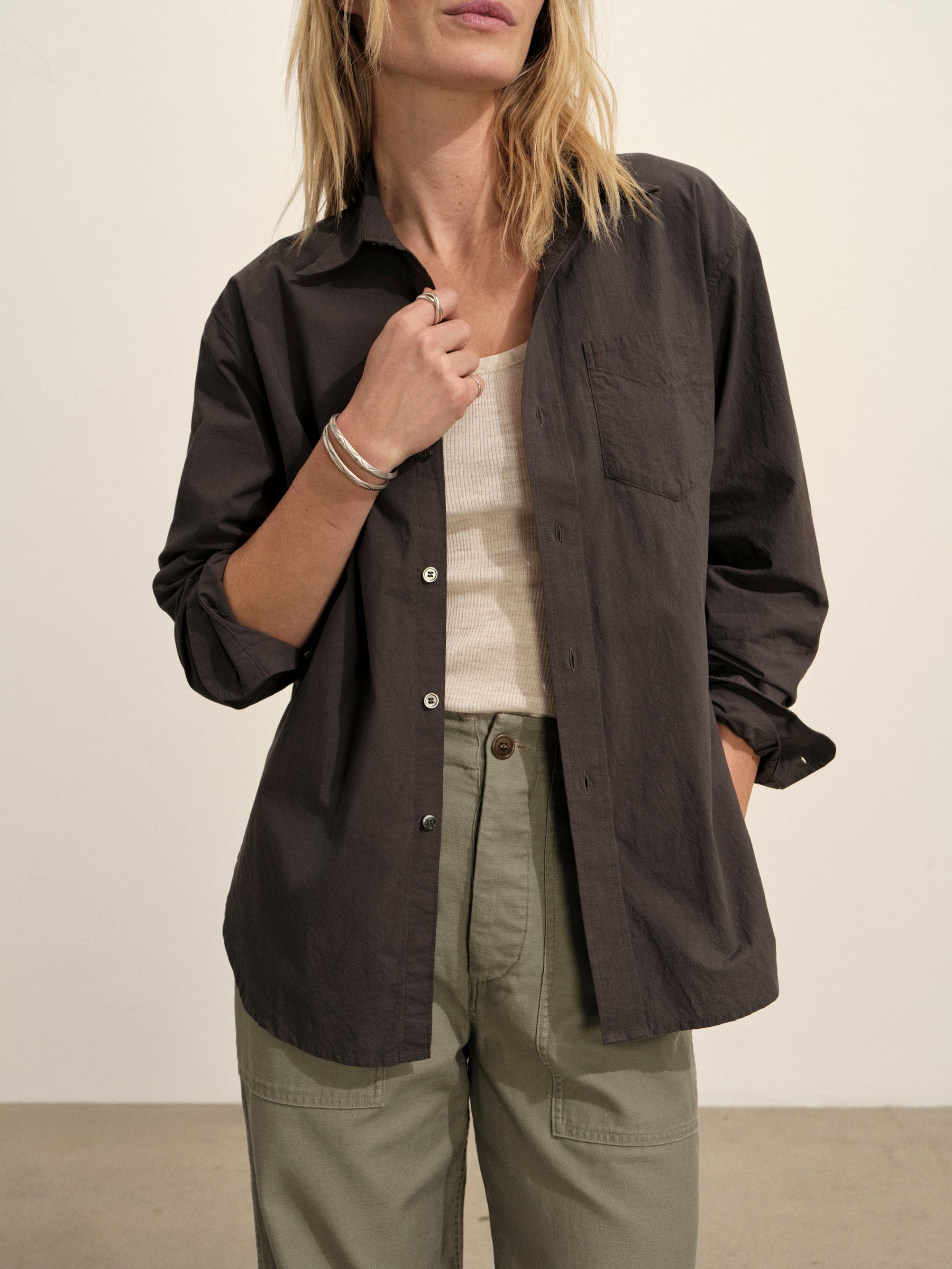 Relaxed button-down shirt in 3.7 oz. cotton plainweave. 29.5” length hits just below the hip. Details include a back yoke with box pleat, a single spade pocket, and pleated cuffs. Inspired by mid-century men’s shirting, this piece can be worn on its own, layered over a tee, or paired with our Rider Pant. Garment washed with softener for a lived-in feel.