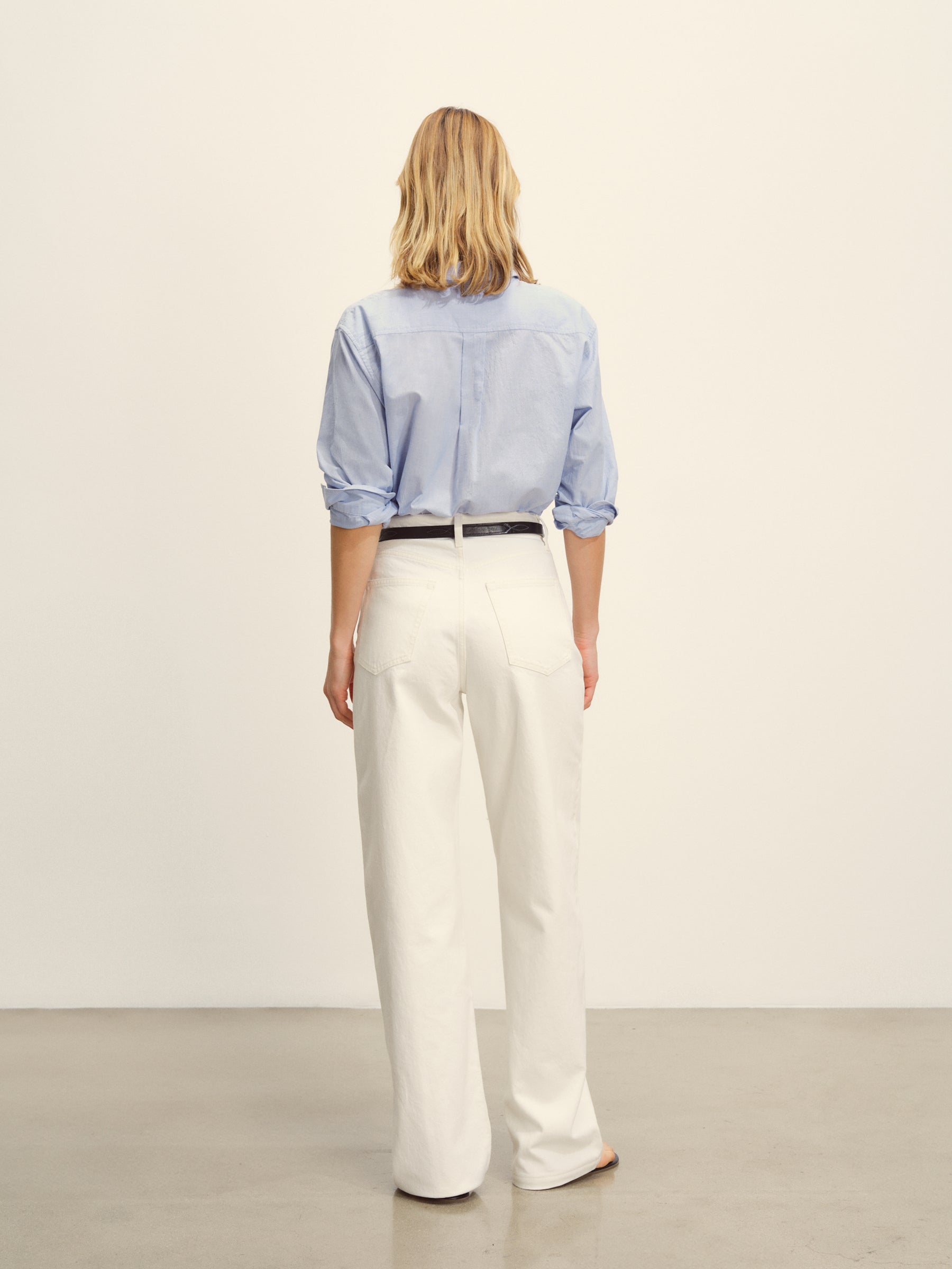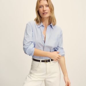 Relaxed button-down shirt in 3.7 oz. cotton plainweave. 29.5” length hits just below the hip. Details include a back yoke with box pleat, a single spade pocket, and pleated cuffs. Inspired by mid-century men’s shirting, this piece can be worn on its own, layered over a tee, or paired with our Rider Pant. Garment washed with softener for a lived-in feel.