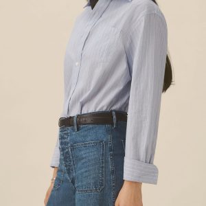 Relaxed button-down shirt in 3.7 oz. cotton plainweave. 29.5” length hits just below the hip. Details include a back yoke with box pleat, a single spade pocket, and pleated cuffs. Inspired by mid-century men’s shirting, this piece can be worn on its own, layered over a tee, or paired with our Rider Pant. Garment washed with softener for a lived-in feel.