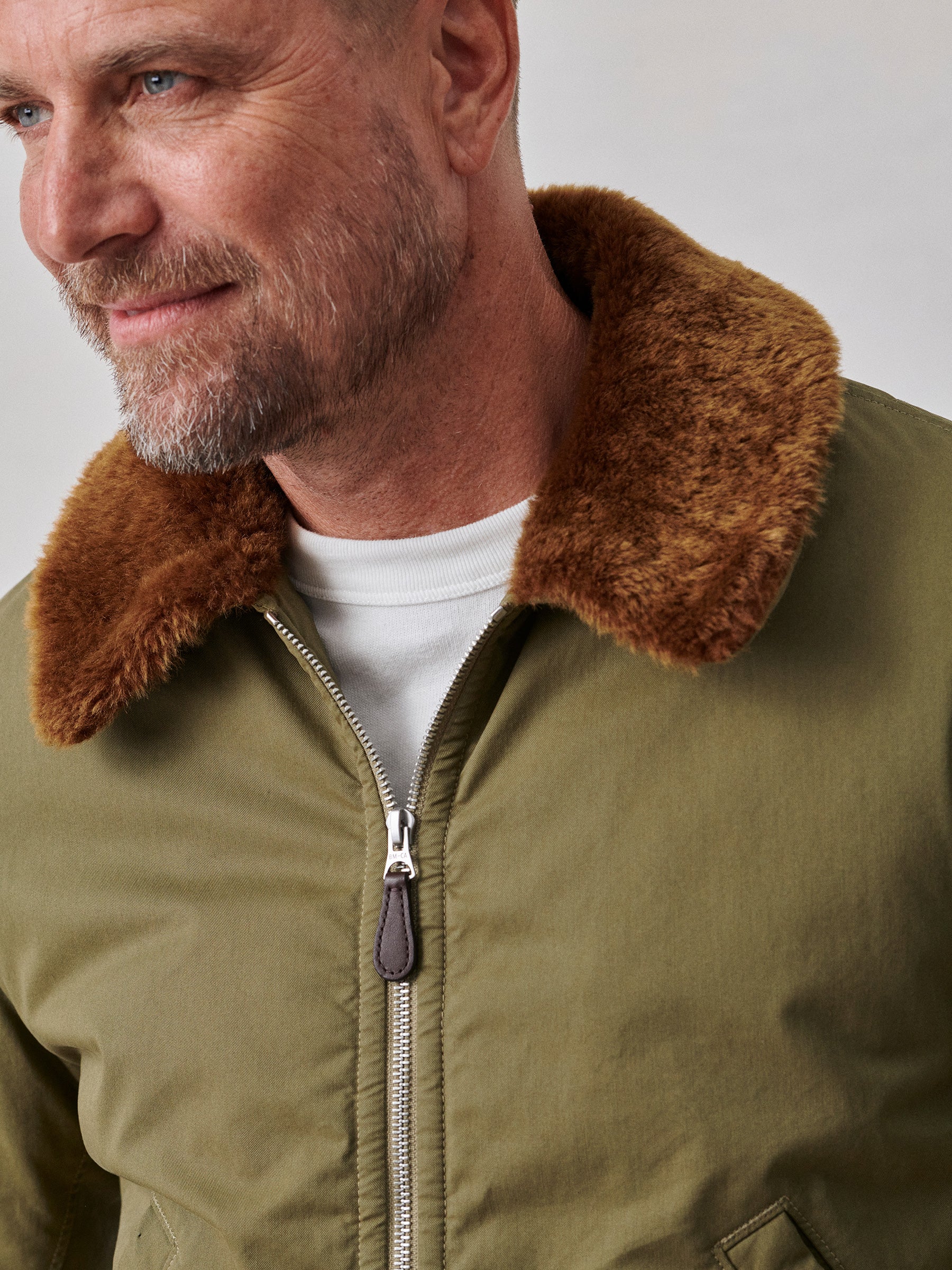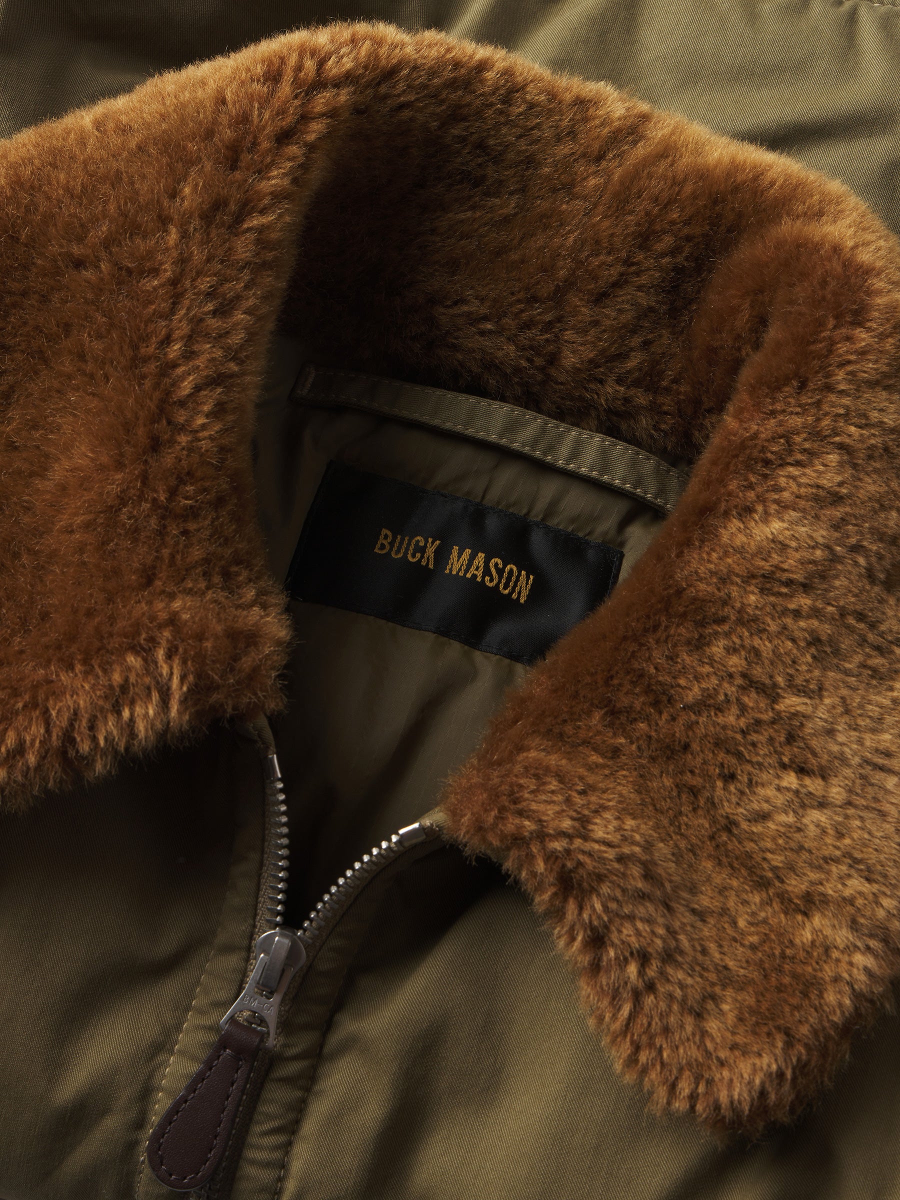 In 1944, the B-15 jacket became standard issue for the USAAF. We’ve brought it into the 21st century with a premium weather cloth we developed with Olmetex in Italy, blending a premium finish with all-weather performance. Filled with PrimaLoft insulation, it’s finished with a shearling collar, corozo-buttoned throat latch, enamel-coated snap front pockets, interior welt pocket, die-cast zip front closure, and rib cuff and hem.