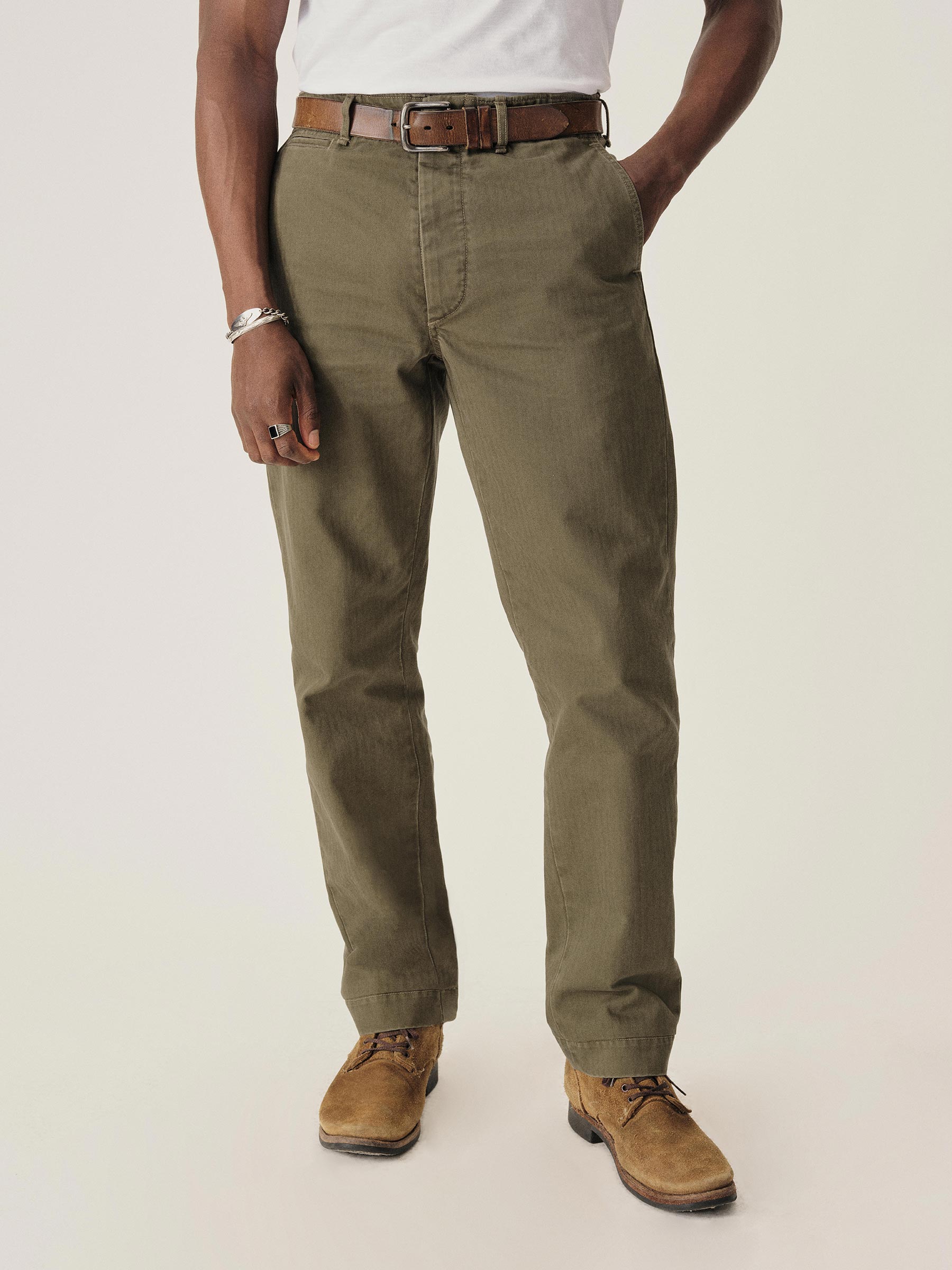 The classic officer’s pant in our Maverick Slim Fit: mid-rise, slim through the thighs with a taper below the knee. Cut from a midweight cotton HBT that’s been washed to achieve the same look and feel of vintage service uniforms. Featuring a one-piece “Hollywood” waistband, slash front pockets, welted back pockets, and a welted coin pocket. Finished with real corozo buttons. Garment washed for a lived-in feel. Button fly.