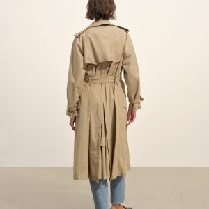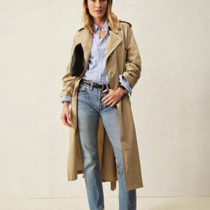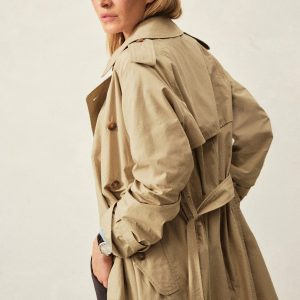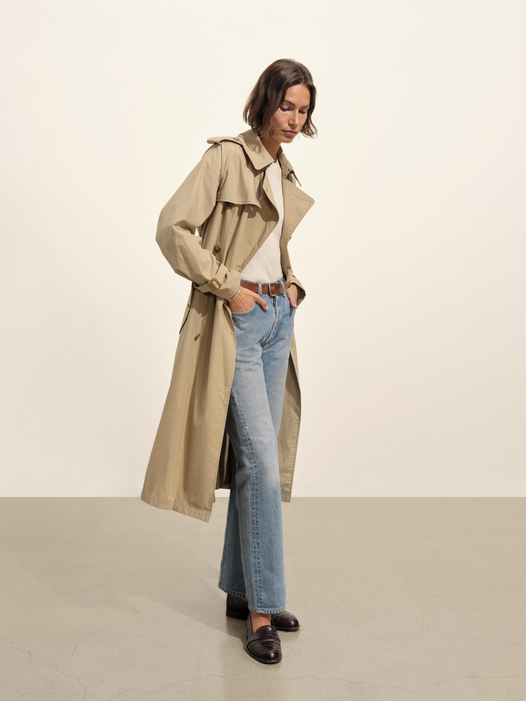 Relaxed trench coat cut from lightly structured 5.5 oz. cotton poplin. Featuring a double-breasted front, gun flap, storm flap, and raglan sleeves with adjustable belts. Detailed with horn/urea buttons, a throat latch with adjustable closure, leather buckles and prongs, and embroidery eyelets. The collar is finished with trapunto stitching, while the interior boasts a half lining for comfort.