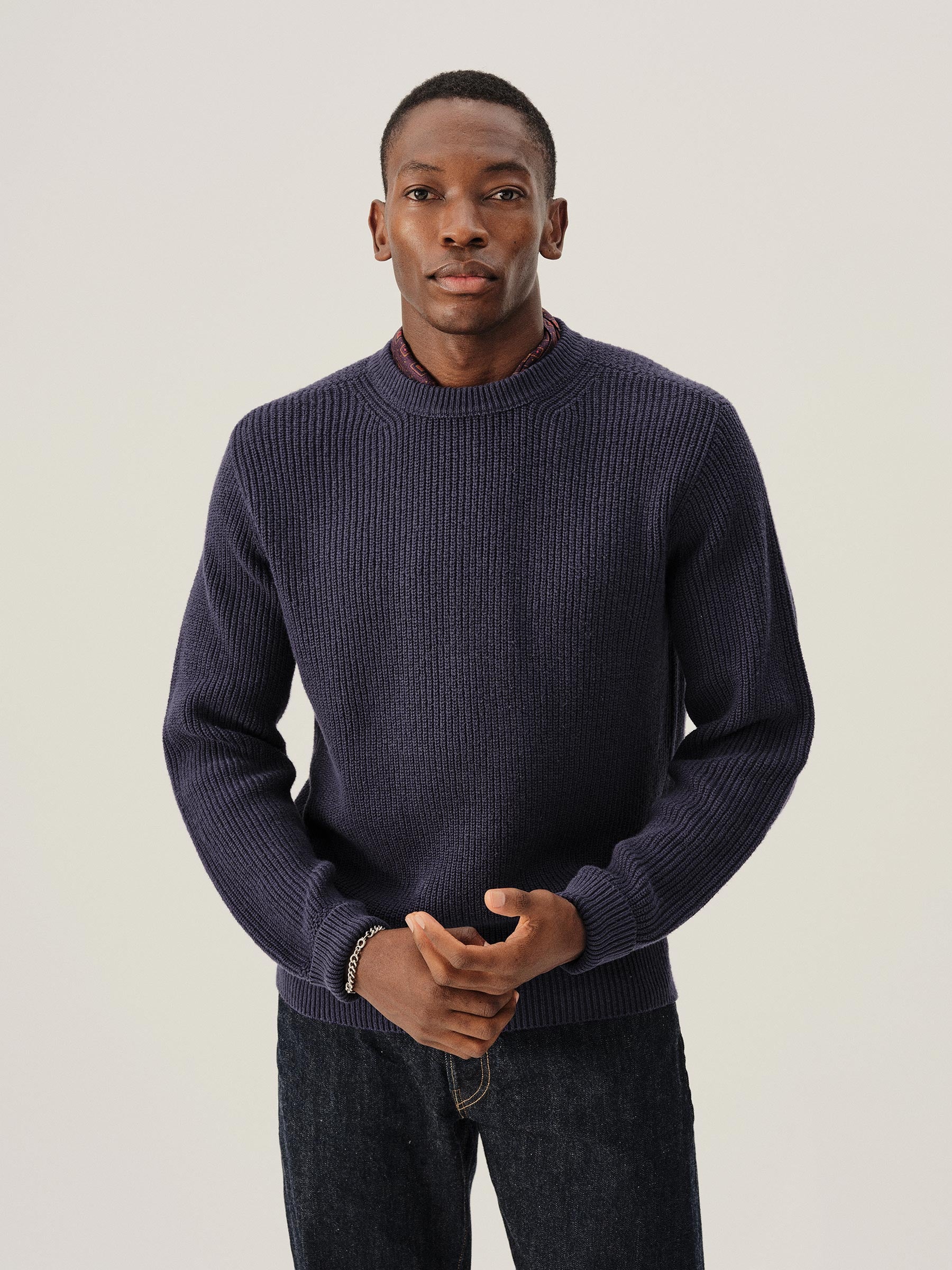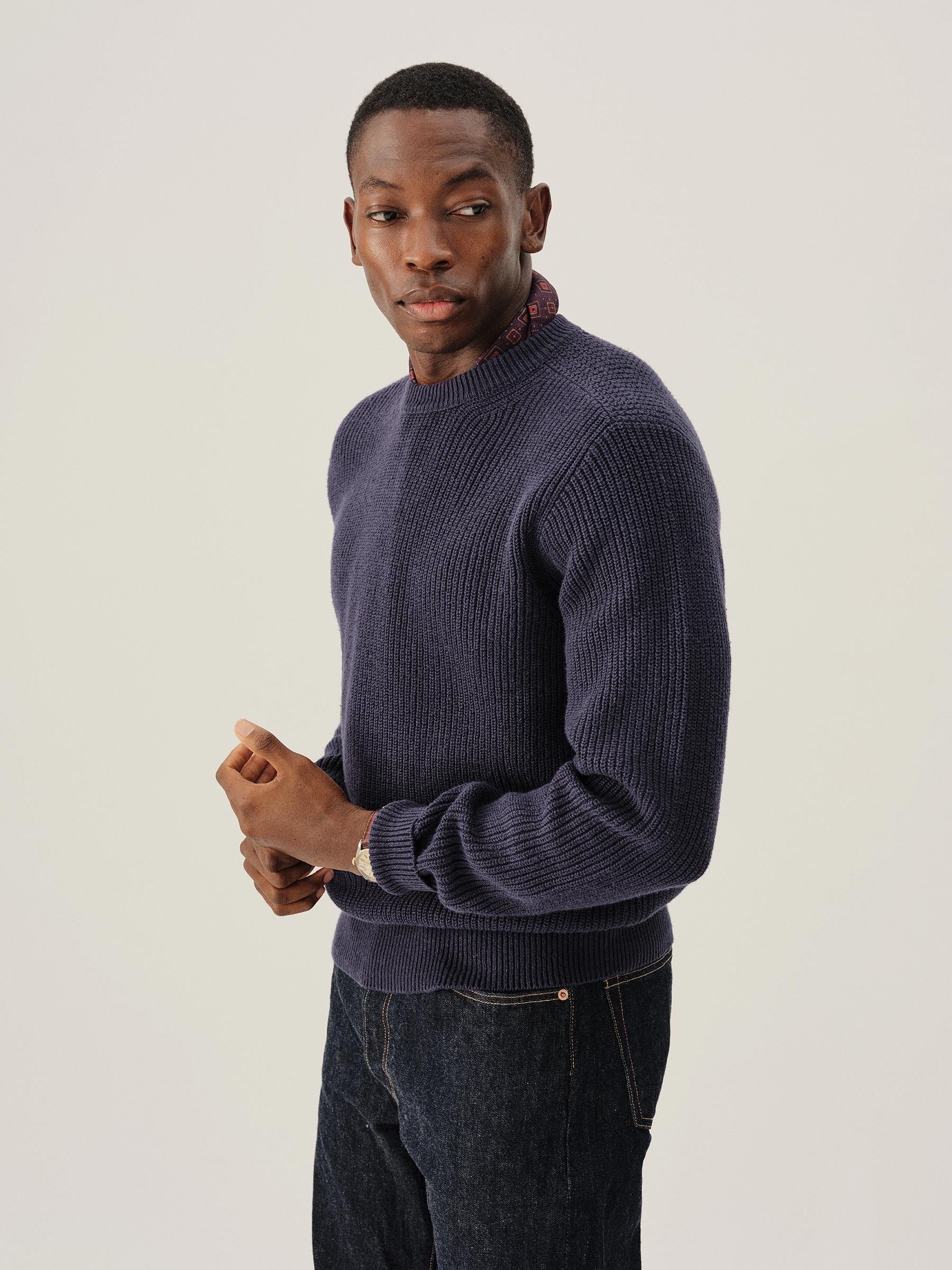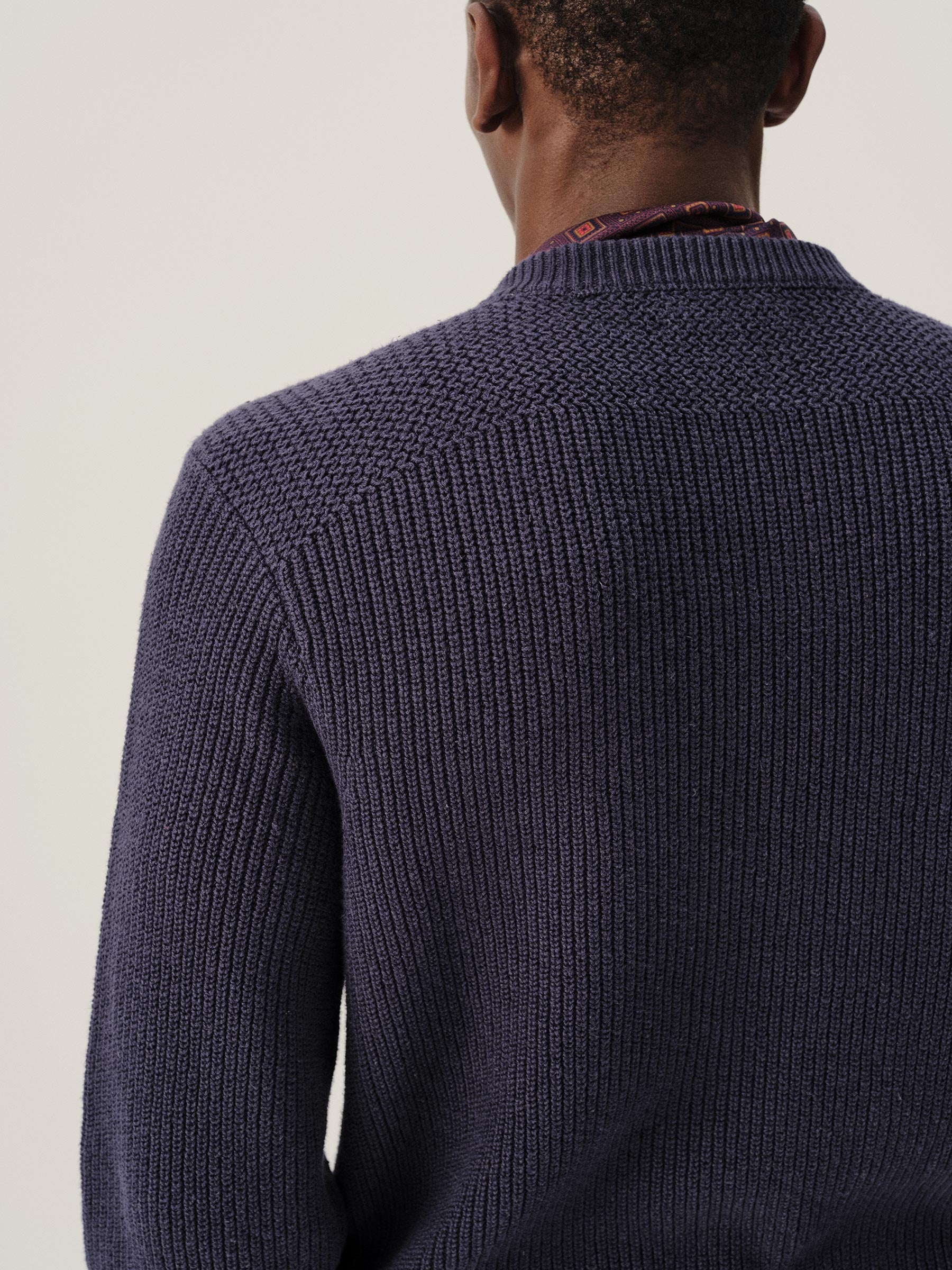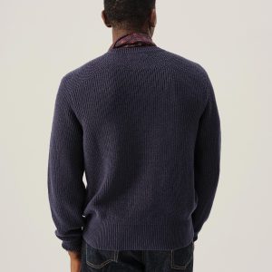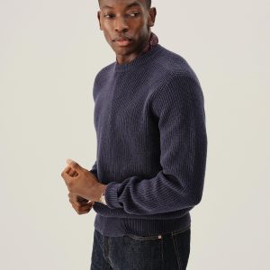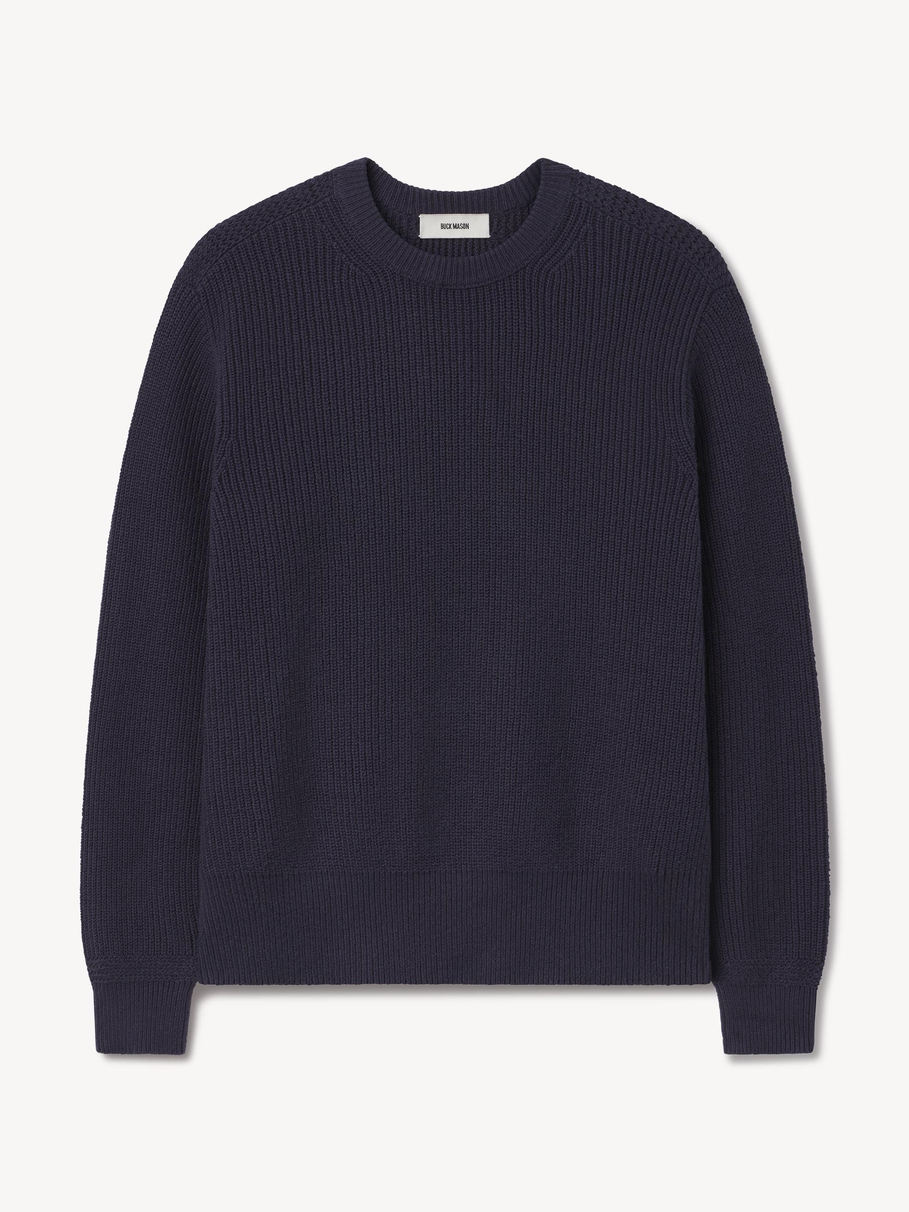 Classic fit crewneck sweater in a homespun textured cotton rib. Constructed with hand-linked seams, double layer ribbing at the collar, and racking stitch detailing at the cuffs.