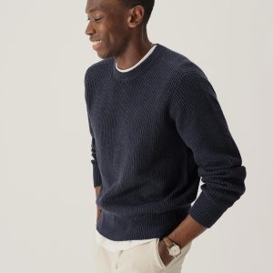 Classic fit crewneck sweater in a homespun textured cotton rib. Constructed with hand-linked seams, double layer ribbing at the collar, and racking stitch detailing at the cuffs.