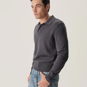 Classic fit polo sweater in a 7 gauge half cardigan rib knit from our homespun yarn-dyed cotton. Features a 3-button rib center front placket with nacre buttons and a rib collar designed to lay flat. Constructed with hand-linked seams and racking stitch detailing at the cuffs.