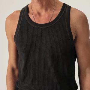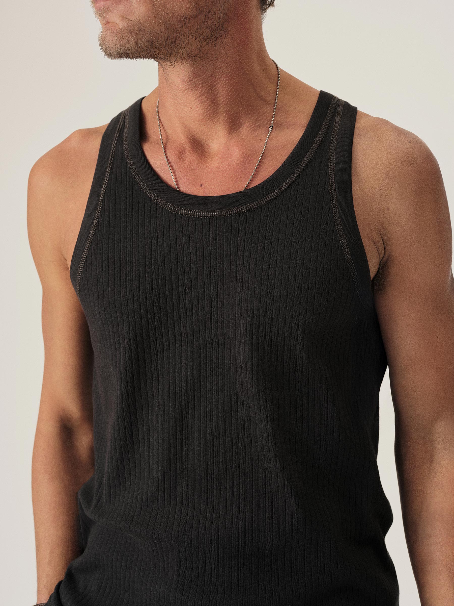 Inspired by the utilitarian design of midcentury military surplus, a distinctly textured tank featuring a 10×2 variegated rib layout. Made from 100% cotton with a 140 GSM weight that’s equally structured and breathable. Constructed with cover stitch detailing along the shoulder seams and bindings. Washed for a lived in feel.