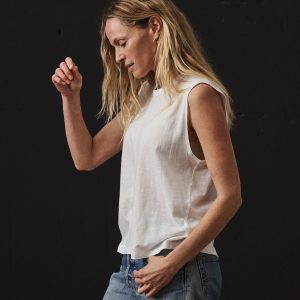 Relaxed muscle tank with a straight hem, cut from 125 GSM cotton with light slub texture. Modeled on a vintage men’s tee with the sleeves cut off. Knit in Los Angeles and washed for a lived-in feel.