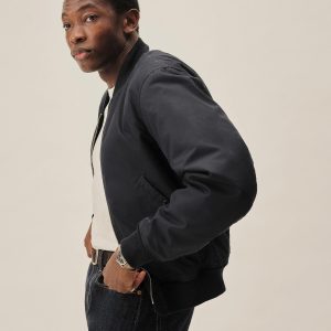 Classic fit, fully lined bomber jacket cut from a 5.5 oz. yarn-dyed cotton/poly twill with a durable water repellent finish. Details include angled flap hip pockets, ribbing at the collar, and articulated two-piece sleeves. Zip front closure. Insulated with PrimaLoft®.