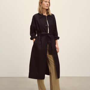 Relaxed, vintage-inspired trench coat cut from 5.7 oz. yarn-dyed cotton/poly twill weather cloth with a DWR finish. Features welt pockets, raglan sleeves, and a deep back vent. Details include a collar tab, button and tab cuffs, and a removable belt with leather buckle for cinching the waist. Size down for a more fitted silhouette.