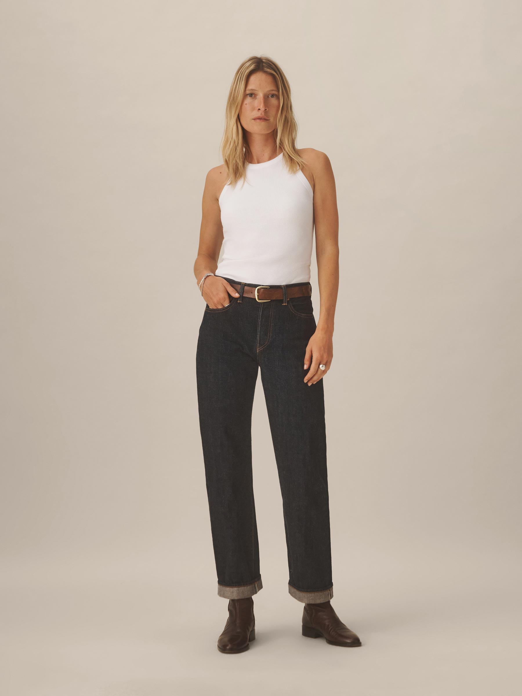 Slim fit, vintage military-inspired tank cut from 295 GSM stretch cotton that holds its shape. 2×2 rib structure—two rows of rib stitch, two rows of jersey stitch—is offset by contrast 1×1 ribbing at the neck. Features a hidden thread chain and snap at each shoulder to hold bra straps in place. Constructed with flatlock stitching throughout and double needle coverstitching at the hem. Garment washed for a lived-in feel.