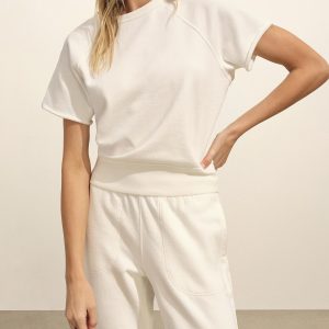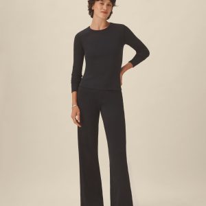Straight leg, high-waisted 2×2 rib knit pant cut from 295 GSM stretch cotton that holds it shape. Fits comfortably at the waist with a wide elastic waistband with a full length inseam measuring 31 3/4”. Garment washed for a lived-in feel.