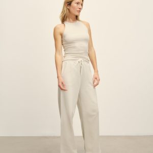 Wide leg, high-waisted sweatpants with a 28” inseam. Can be worn at the natural waist or lower for a more relaxed fit. Cut from 290 GSM cotton French terry with a semi-brushed back. Features a wide, ribbed waistband with drawcord for fit adjustments. Constructed with straddle stitching at seams for durability. Garment dyed and washed for a lived-in feel. Pair with our Vintage Overloop Crew.