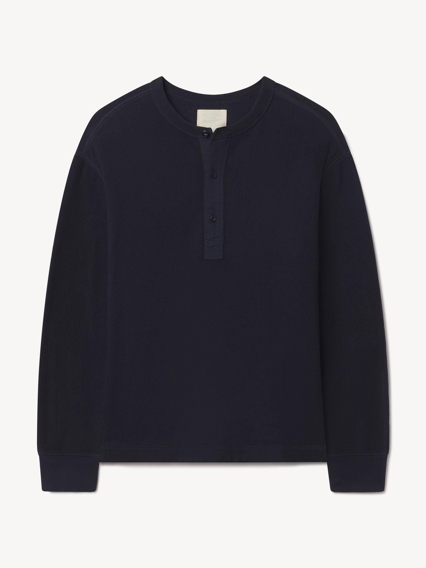 Classic fit thermal long sleeve henley with a straight hem. This 250 GSM French rib cotton double knit features a waffle-knit face and a smooth jersey back. Details include a woven three-button placket and corozo buttons. Constructed with ribbed cuffs and flat-lock stitching throughout for improved comfort and durability. Garment washed with enzymes and softener for a lived-in feel.