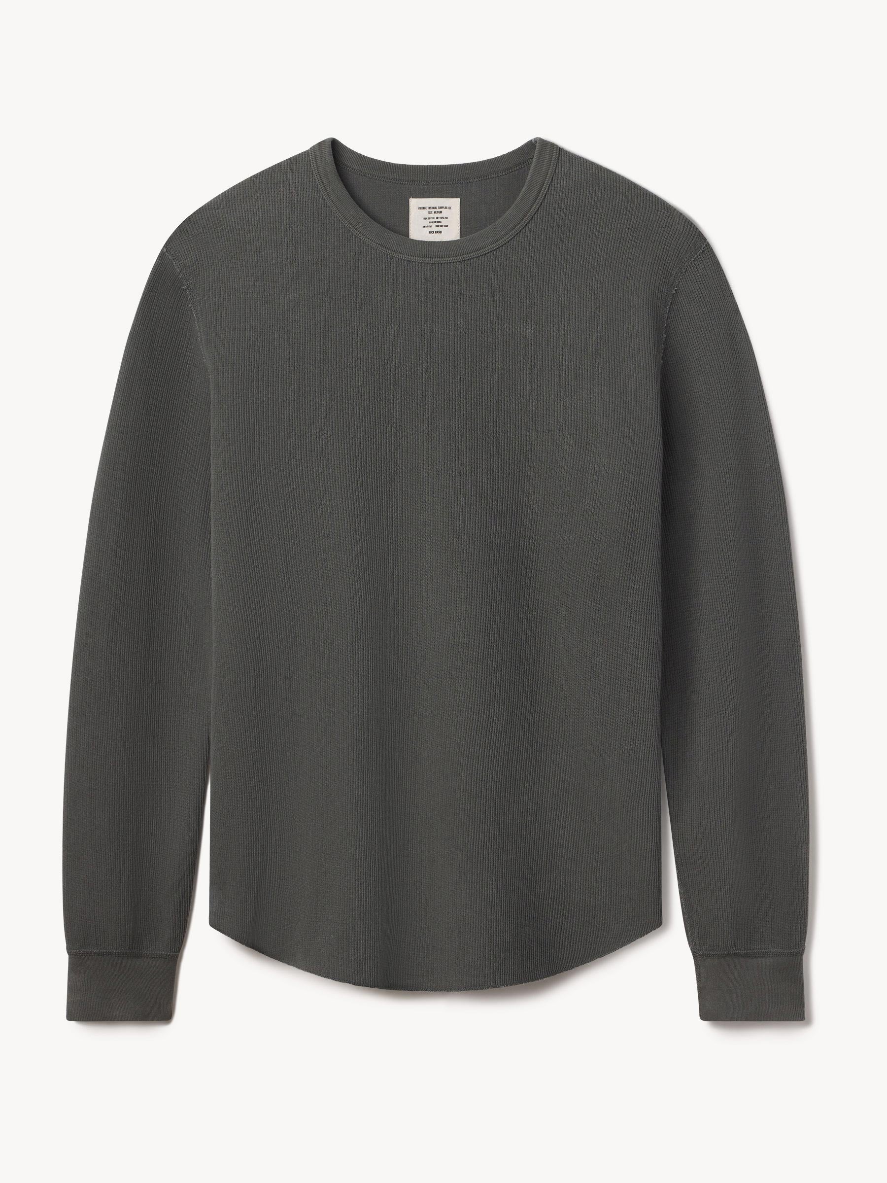 Classic fit thermal long sleeve crewneck tee with our signature curved hem. This 250 GSM French rib cotton double knit features a waffle-knit face and a smooth jersey back. Constructed with ribbed cuffs and flat-lock stitching throughout for improved comfort and durability. Garment washed with enzymes and softener for a lived-in feel.