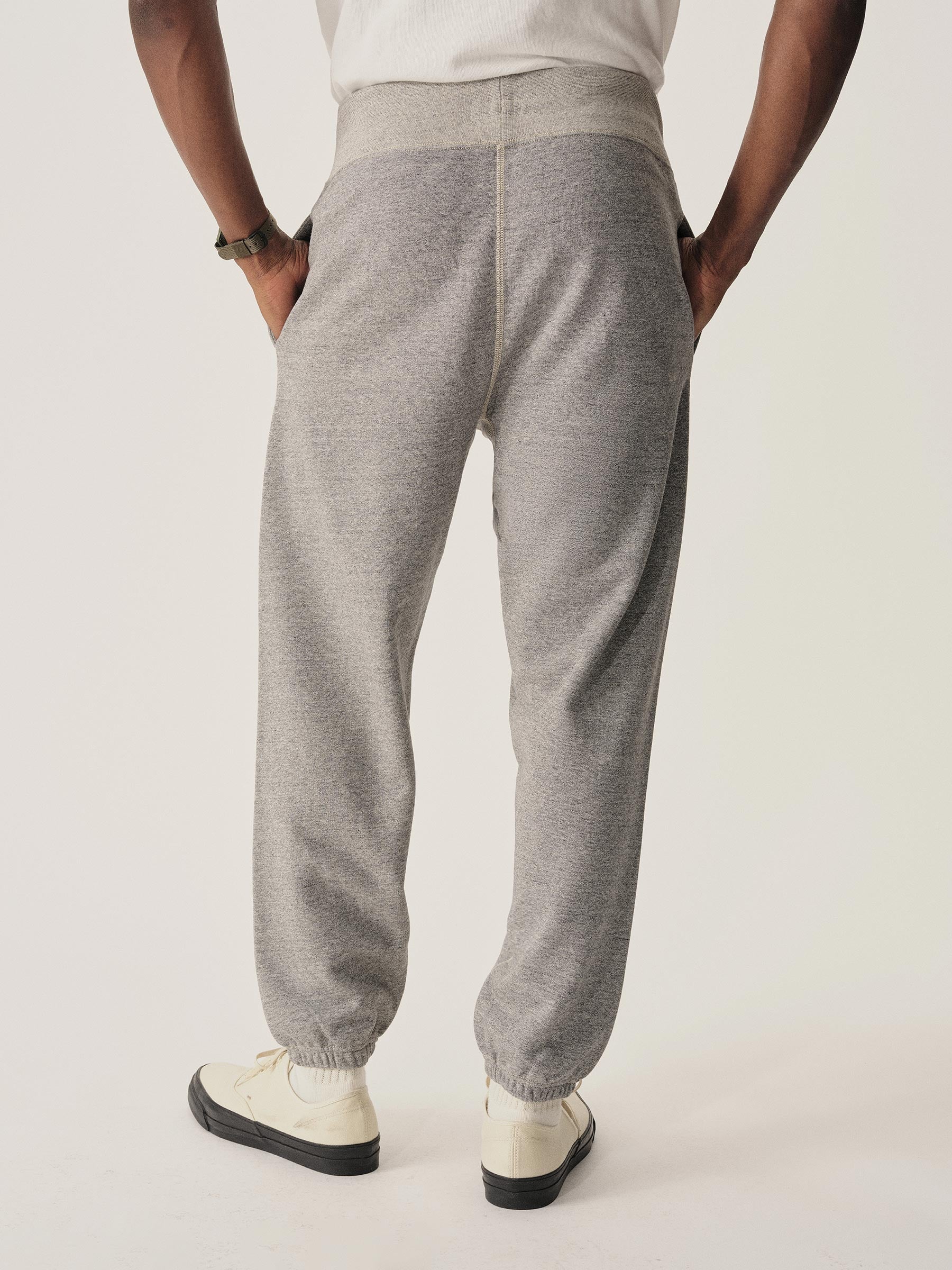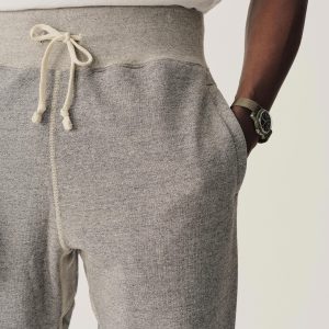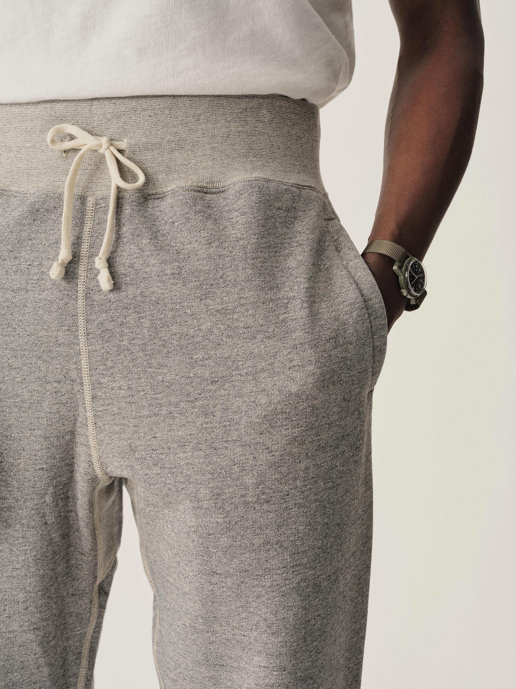 A 1940s-inspired sweatpant made from plush, not-too-heavy, not-too-light, welterweight French terry. Features a wide rib waistband and drawcord waist closure.