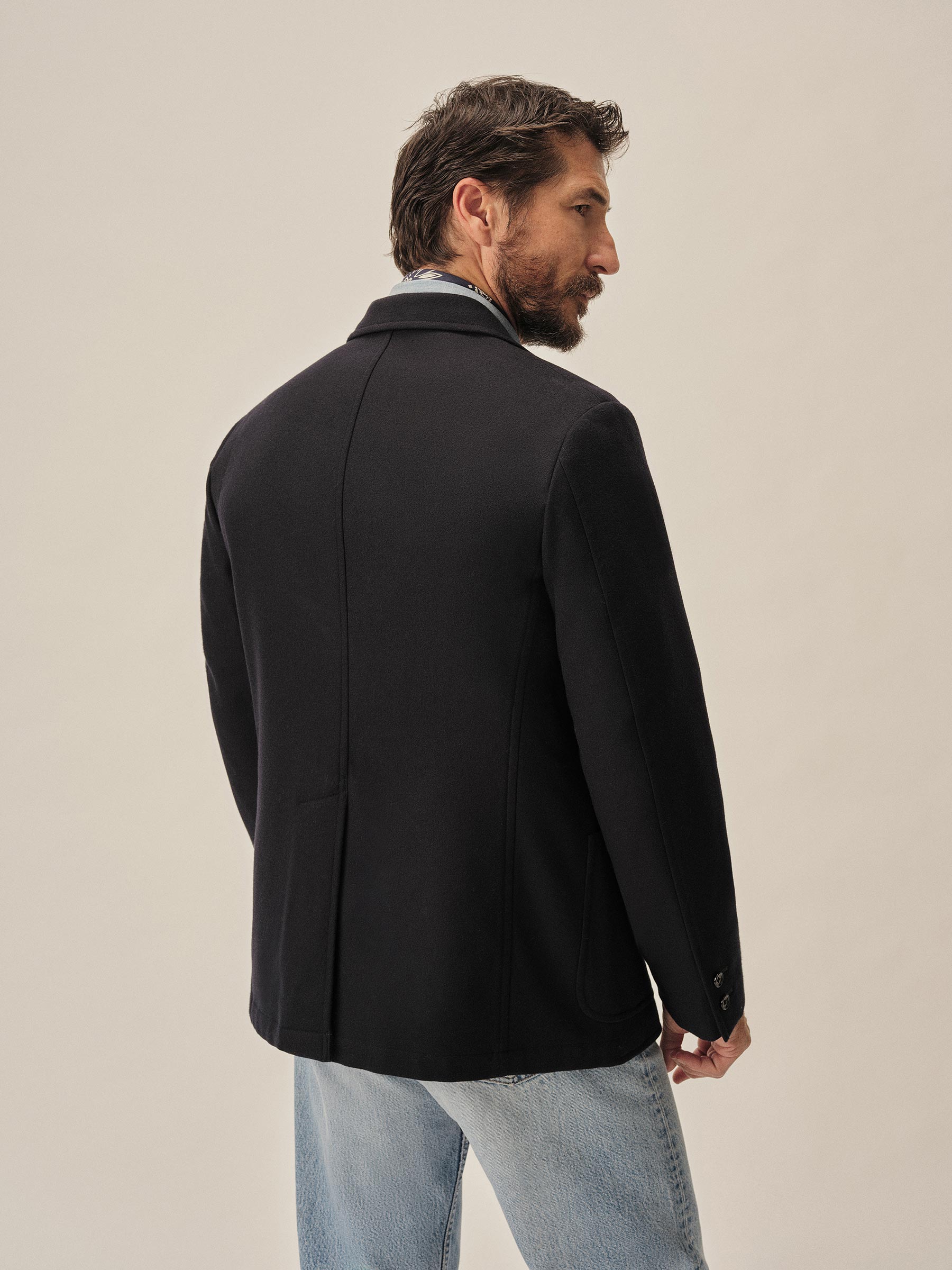 An Ivy-inspired American blazer crafted from a blend of wool and cashmere. Designed with a 3-roll-2 button stance, open patch pockets, and a functional sleeve vent with two horn buttons. Cut with a center back seam and left unlined through the body for a relaxed, unstructured feel, while the sleeves are fully lined in viscose for smooth layering.